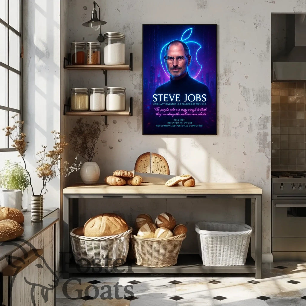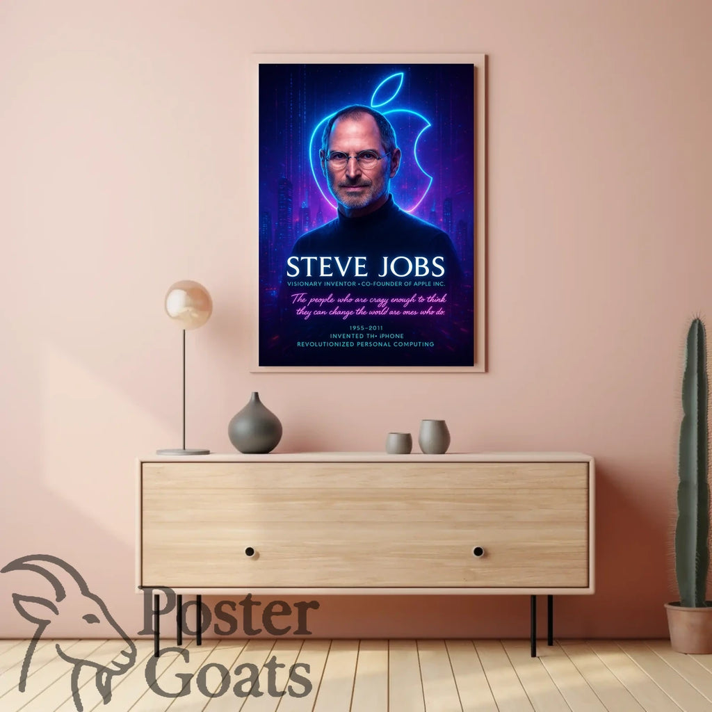 This captivating poster celebrates the monumental achievements of Steve Jobs, co-founder of Apple Inc., through a vibrant and modern artistic interpretation. At its heart is a striking portrait of Jobs wearing his iconic glasses, set against a luminous Apple logo that signifies his transformative role in personal computing and the invention of the iPhone. The background cityscape, depicted with futuristic neon lighting, underscores the theme of innovation and technological advancement. Designed to inspire and motivate, this poster is a bold tribute to creativity and groundbreaking success, making it an ideal addition to any tech enthusiast's collection.