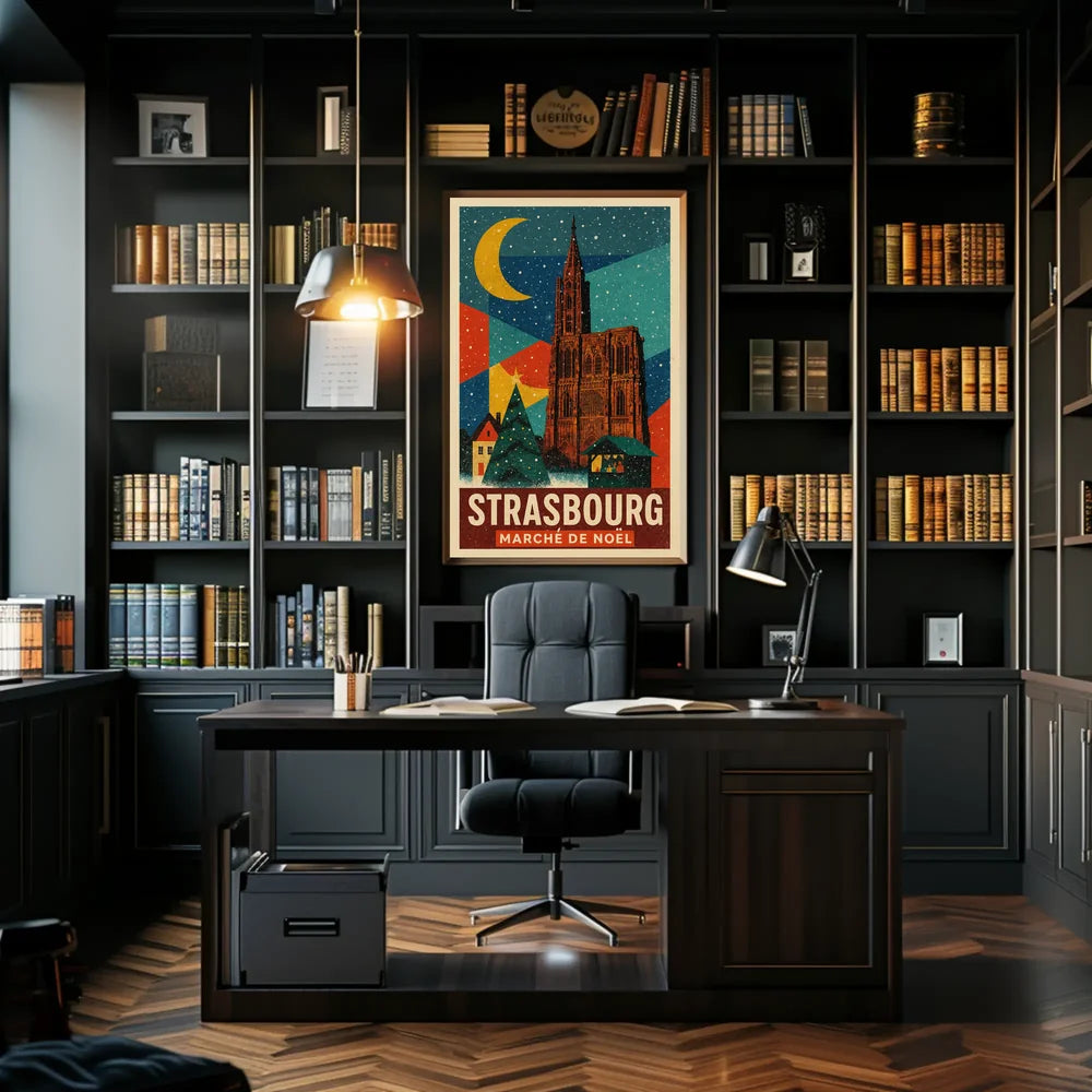Whether you lean toward vintage design or a contemporary modern graphic, this poster blends traditional charm with a stylish, versatile aesthetic. Display it in living rooms, entryways, classrooms, or offices to enhance cozy decor and festive atmosphere, and to celebrate the magic of the Strasbourg Christmas market, Christmas trees, and the holiday spirit that makes French Christmas traditions so special.