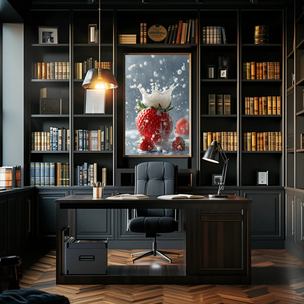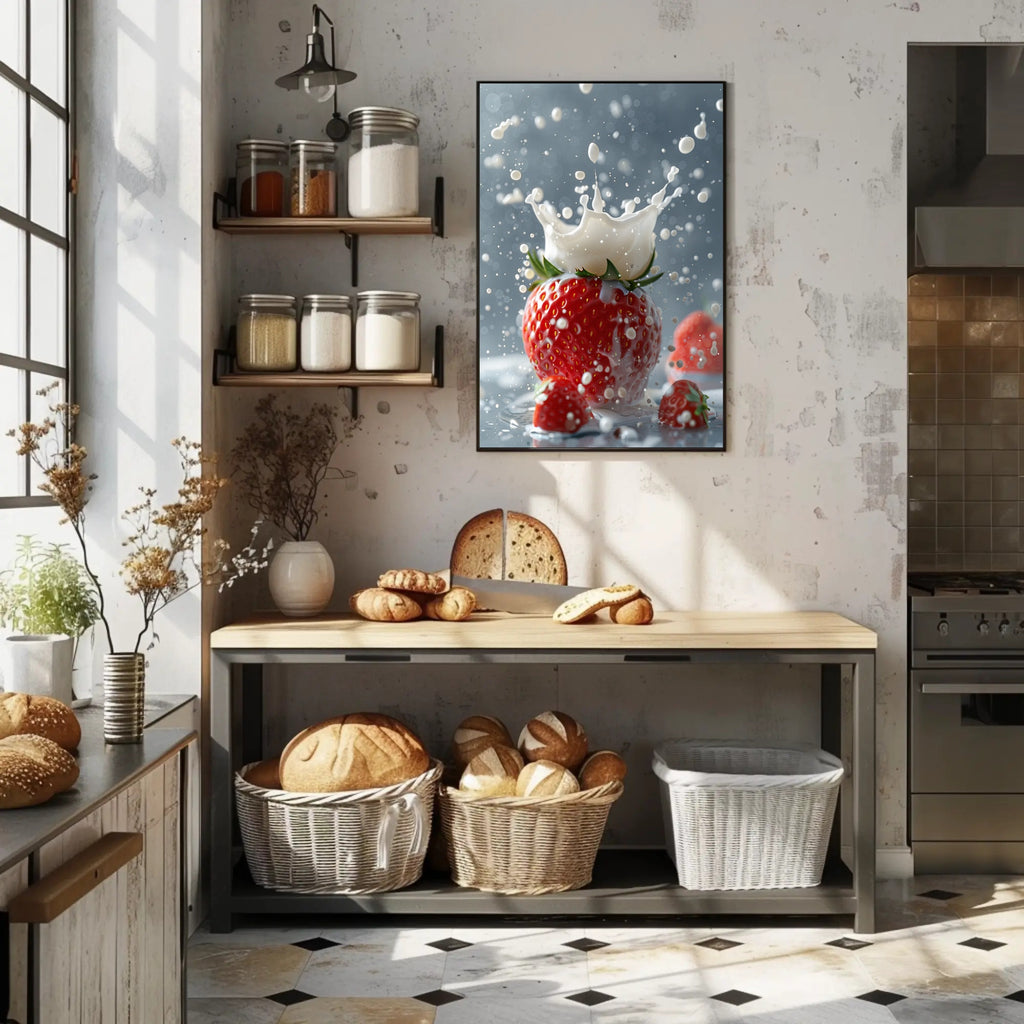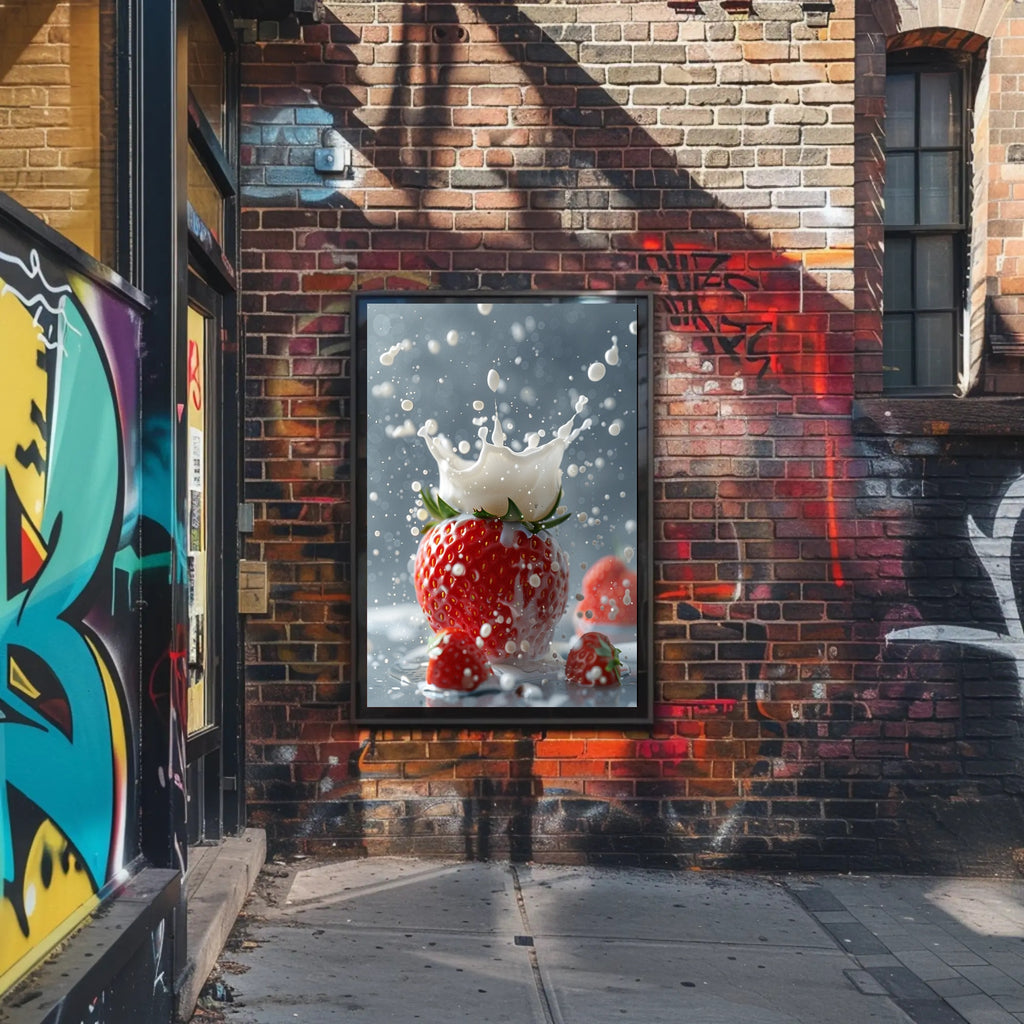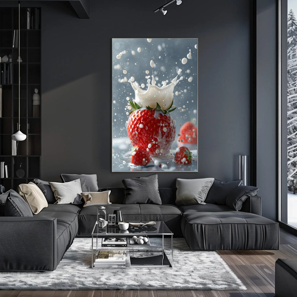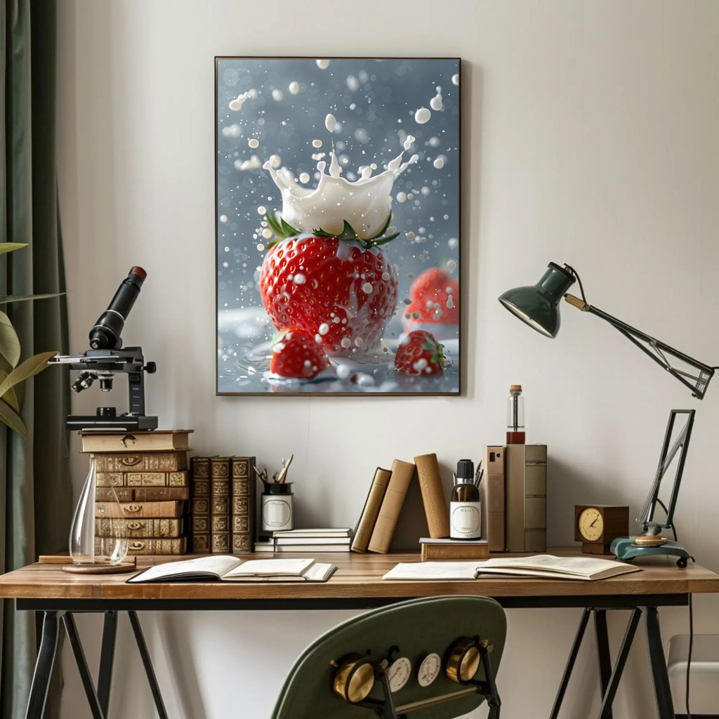 Technical note: High-resolution artwork optimized for print ensures crisp detail of the strawberry texture and milk droplets when framed or mounted.