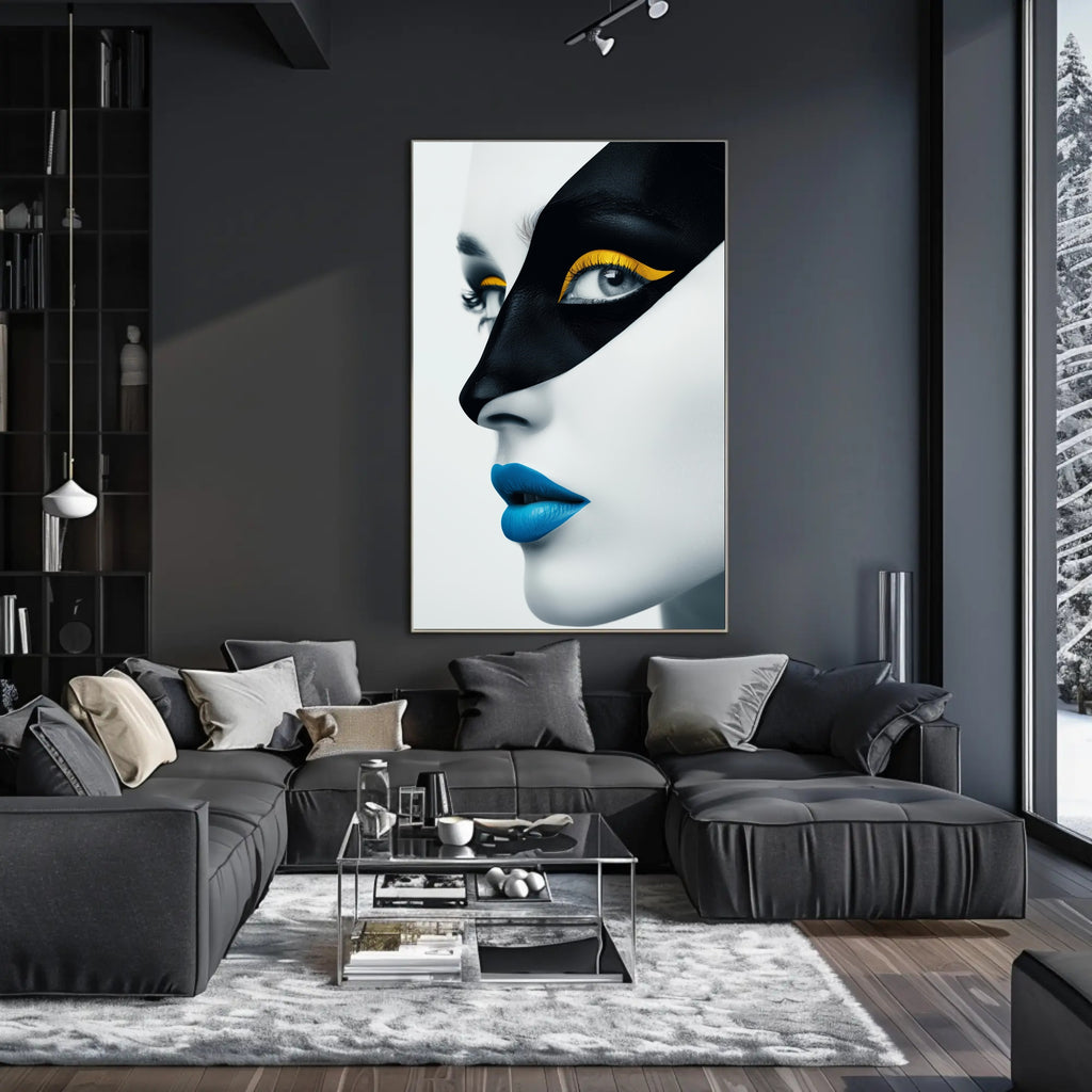Immerse your space in bold expression with this Striking Avant-Garde Portrait from PosterGoat — an artistic poster that fuses contemporary portraiture with surreal, pop-art energy. The close-up composition emphasizes dramatic contrast: monochromatic skin tones set the stage for a black, mask-like pattern across the eyes, vivid yellow eyeshadow, and vibrant blue lips that command attention.