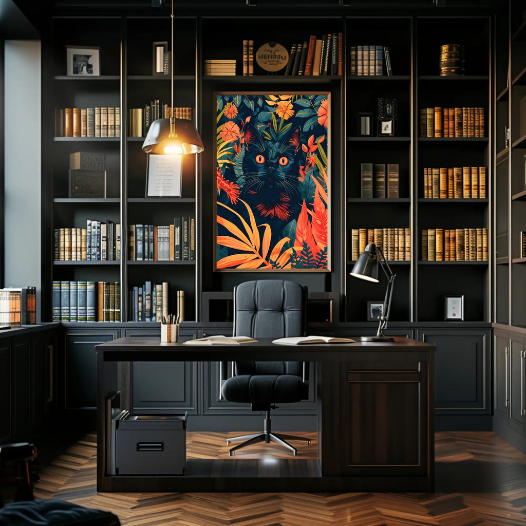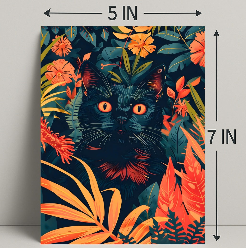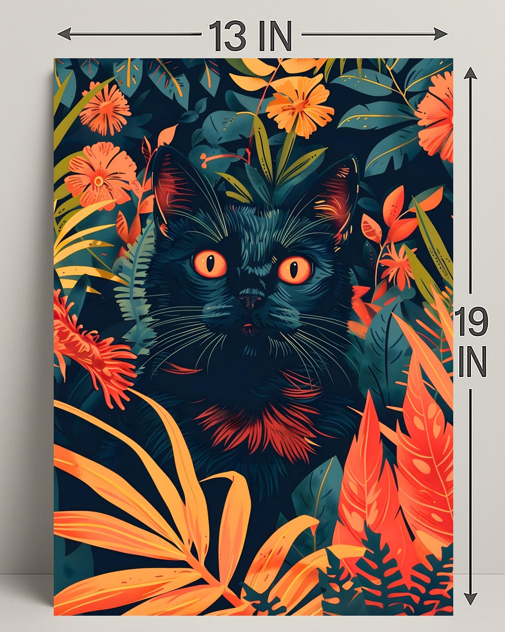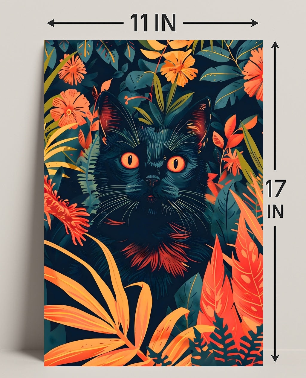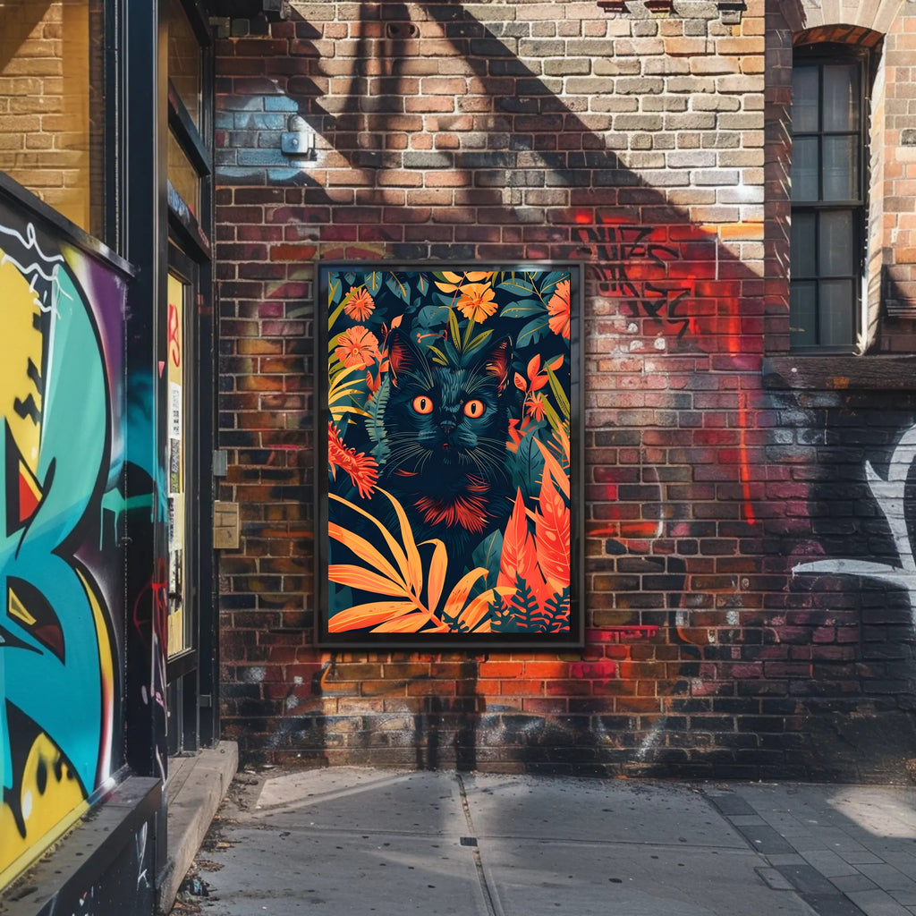 Designed to be a dynamic wall decor accent, this poster balances enigmatic feline charm with rich tropical textures — the dense leaves and floral accents frame the cat’s expressive face for maximum visual impact. The illustration’s layered brushwork and bold color contrast make it a standout piece in modern interiors.