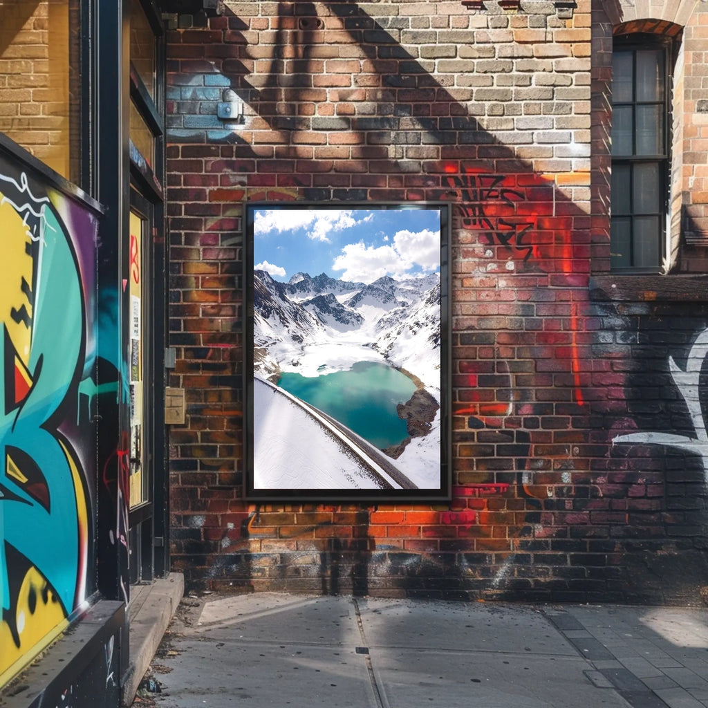 Immerse yourself in the awe-inspiring beauty of this photorealistic poster, featuring a turquoise blue lake cradled by snow-capped mountains beneath a brilliant blue sky. The pristine, high-altitude scene captures untouched majesty and invites a moment of quiet reflection. Perfect for collectors, adventurers, and anyone who wants to celebrate nature's wonder, this alpine landscape poster adds environmental appreciation to any space.
