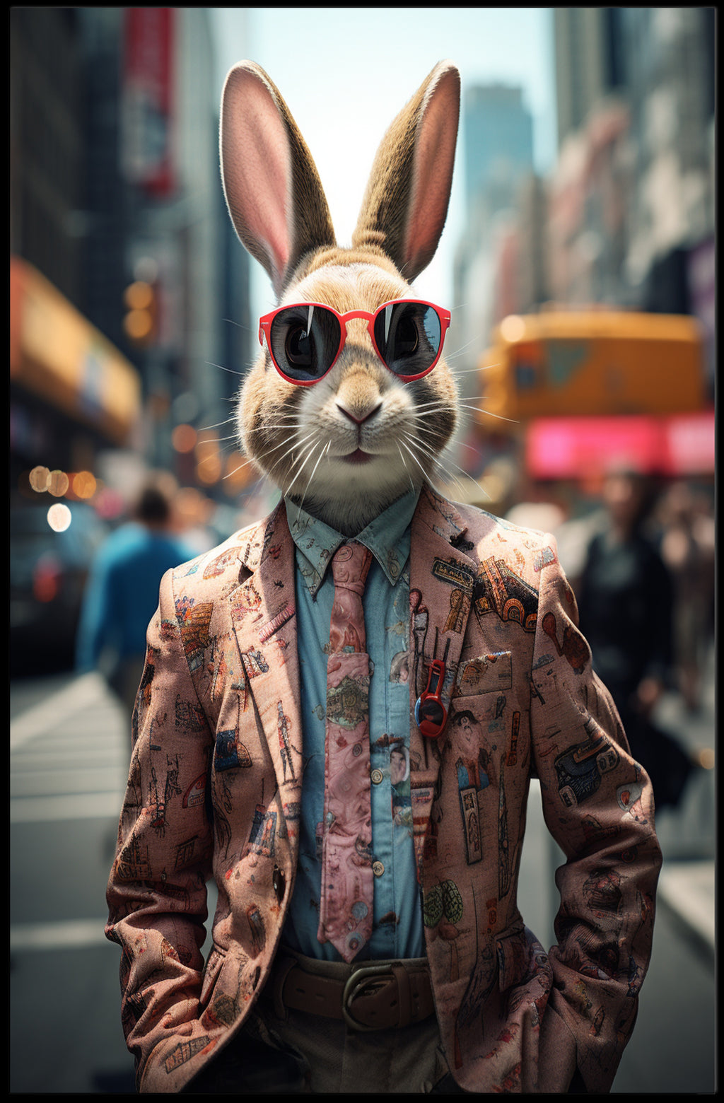 Bring playful sophistication to your walls with the Stylish Rabbit In The City Poster from PosterGoat. This pop-art inspired poster features a dapper rabbit in red sunglasses and a richly patterned blazer, set against a vibrant, blurred urban streetscape — complete with city lights and a yellow taxi that give the print an energetic, metropolitan vibe. Perfect for living rooms, offices, or creative spaces, this eye-catching piece blends whimsical character with modern design.