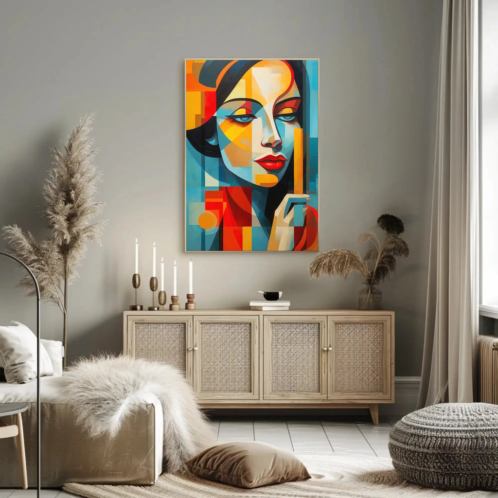 Transform any room with the Stylized Abstract Portrait Woman Contemporary Artistic Poster by PosterGoat — a bold, modern statement piece that fuses pop-art energy with mid-century modern elegance. Rich geometric shapes and layered color blocks form a captivating abstract portrait: turquoise planes, warm ochres and fiery reds converge to create an expressive face with striking red lips and an enigmatic gaze.