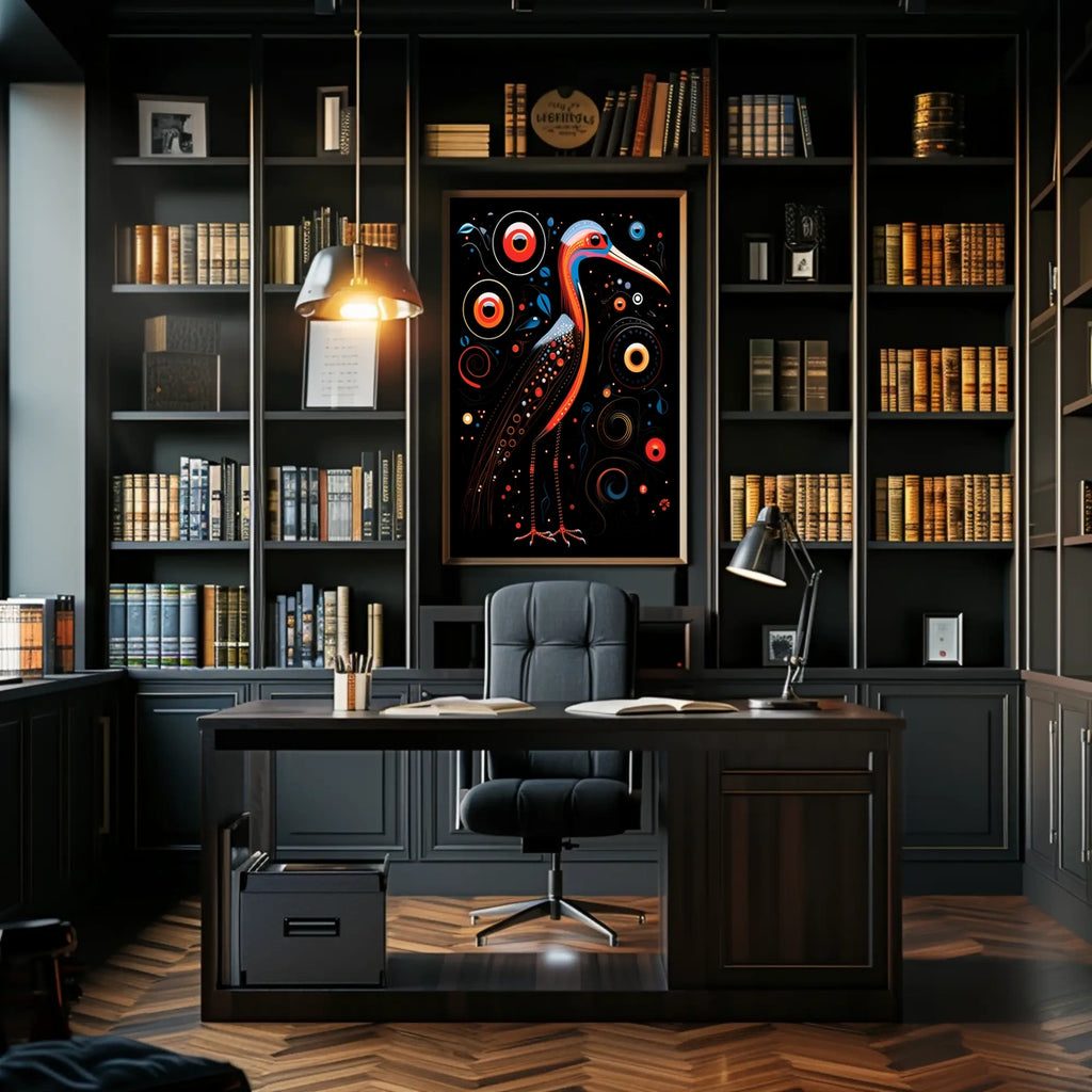 This mesmerizing poster showcases a captivating depiction of a stylized bird, reminiscent of a stork or crane, elegantly set against a dark backdrop. Intricate patterns of dots and lines in vibrant reds, oranges, blues, and whites envelop the bird, creating a striking contrast with the abstract swirling circles that surround it. The modern abstract style emphasizes geometric patterns and vibrant hues, crafting an artwork that is both dynamic and ethereal. Perfect for those who appreciate bold creative expression, this piece invites viewers to delve into its artistic intricacies and imaginative essence.