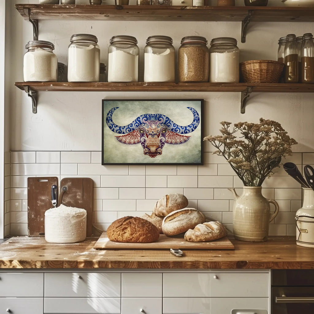 Perfect placement: Hang above a sofa, over a mantel, or in a cafe or kitchen prep area to add instant character and conversation-starting detail. The poster’s balanced composition and bold horns make it especially effective as a central gallery wall piece.