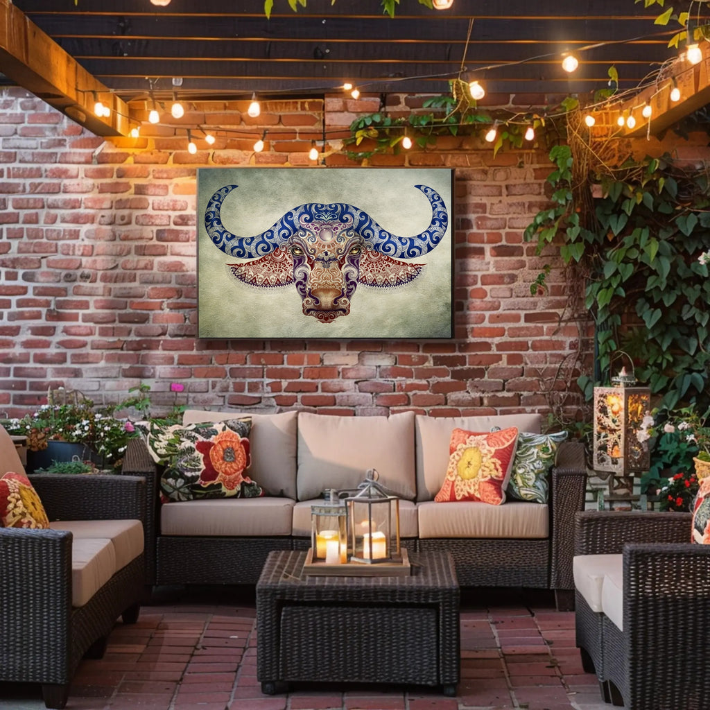 Why it works: The detailed dotwork and ornamental swirls draw the eye into the buffalo’s luminous, expressive eyes, while the large blue horns create dramatic visual contrast that complements exposed-brick living rooms, eclectic lounges, or contemporary kitchens. The muted, parchment-like background allows the intricate design to pop without overwhelming a space, making it an ideal choice for boho, rustic, or nature-inspired interiors.