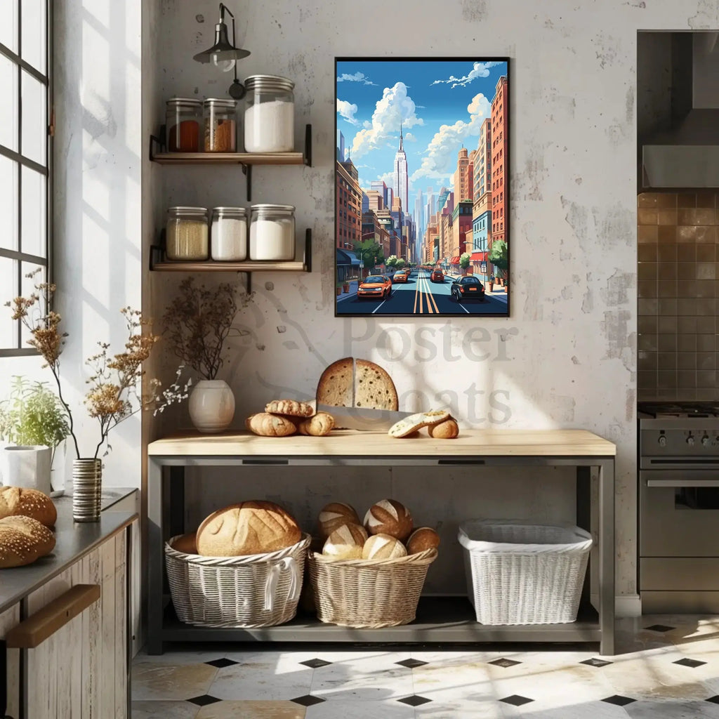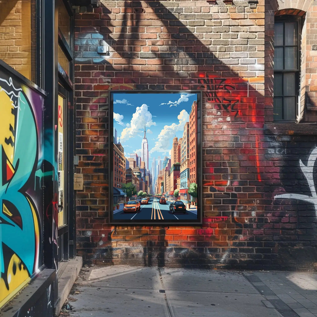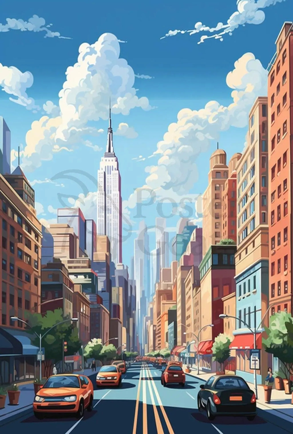 Bring the pulse of the city into your home. This Stylized Cityscape Modern Vibe Urban Architecture Poster from PosterGoat captures a lively street scene inspired by iconic New York avenues — a towering skyscraper, bustling sidewalks, and rows of classic brick and glass buildings rendered in bold, pop-art colors and clean digital illustration lines.