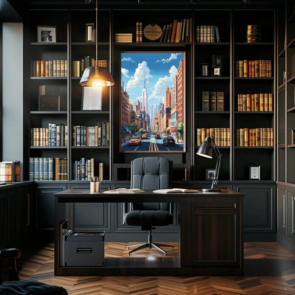 The artwork blends comic-book energy with mid-century modern sensibilities: vivid blue skies with billowing clouds, crisp perspective down a sunlit avenue, and dynamic car and pedestrian details that create depth and movement. It’s an optimistic, contemporary piece that instantly livens living rooms, offices, or creative spaces while complementing modern architecture and Art Deco décor themes.