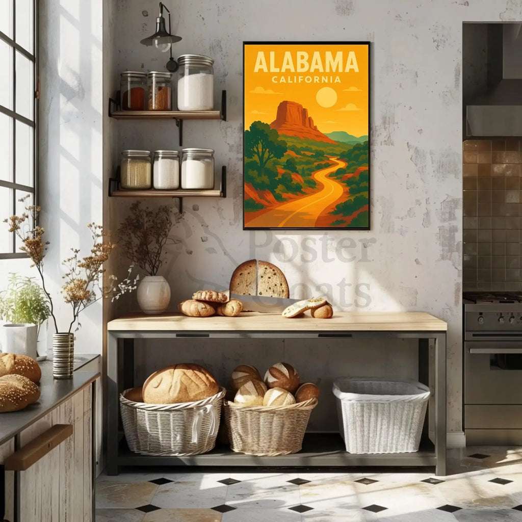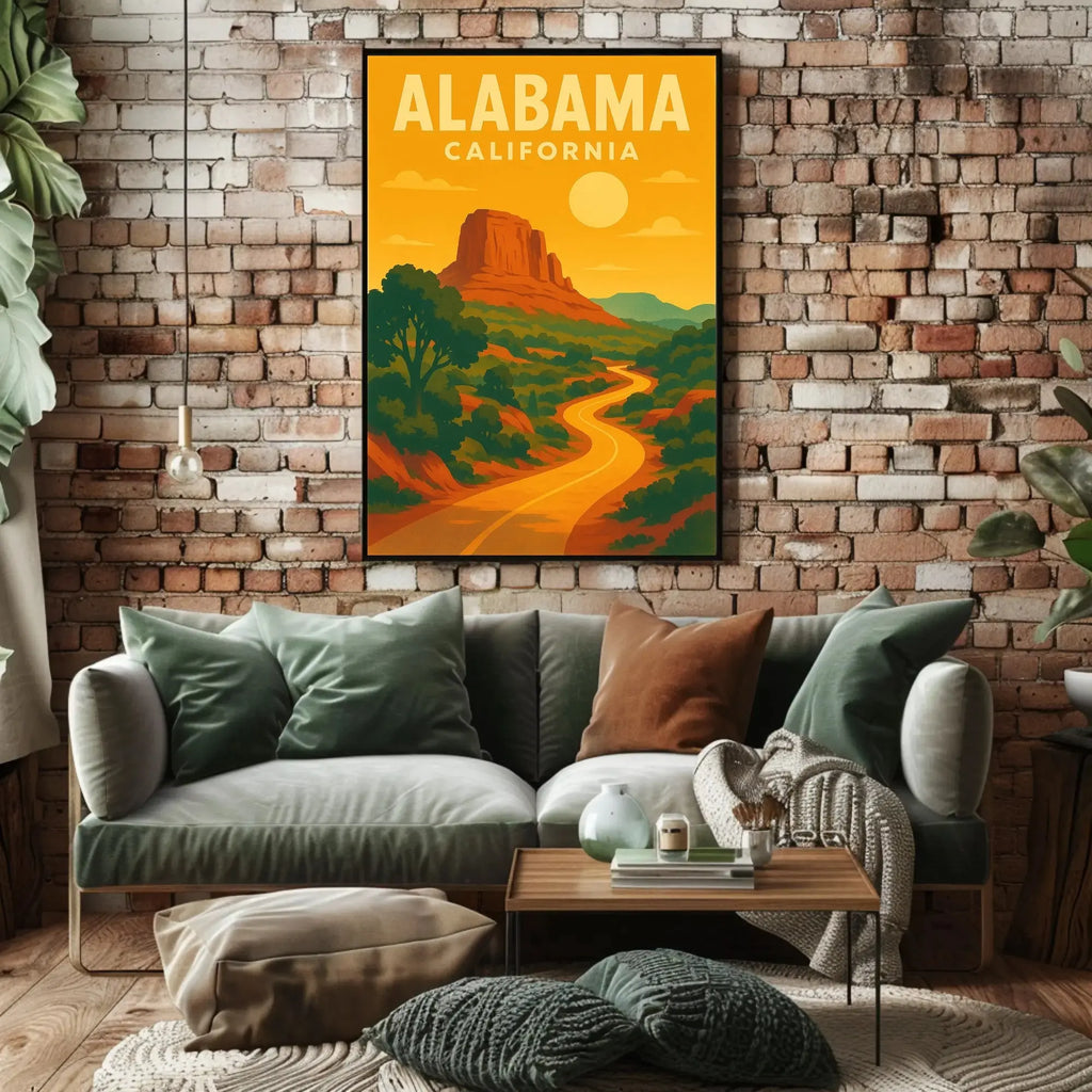 Why you'll love it: The poster's pop-art styling and vibrant colors create instant visual impact while the simplified shapes and foliage details keep the composition modern and timeless. The sweeping road draws the eye into the scene, evoking road trips, exploration, and the quiet thrill of discovery.
