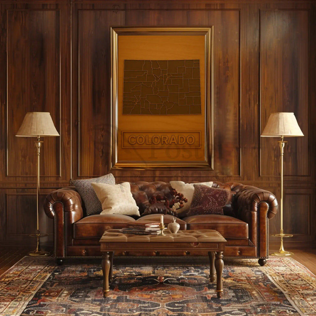 The poster highlights Colorado’s county boundaries with crisp, elegant outlines set against a rich, natural-toned backdrop—perfect for modern, rustic, or travel-inspired interiors. Its simple, typographic “COLORADO” block anchors the design and adds a refined, vintage travel-poster feel without overpowering the map itself.
