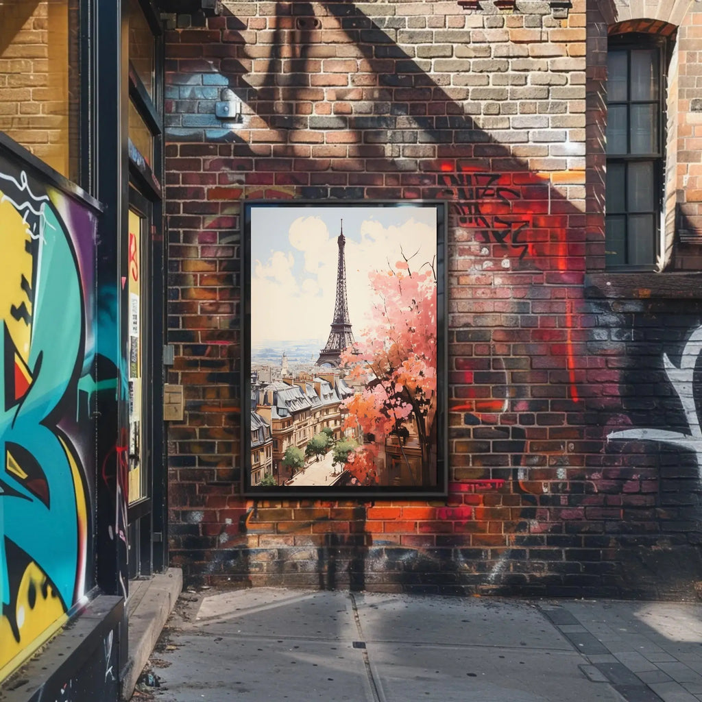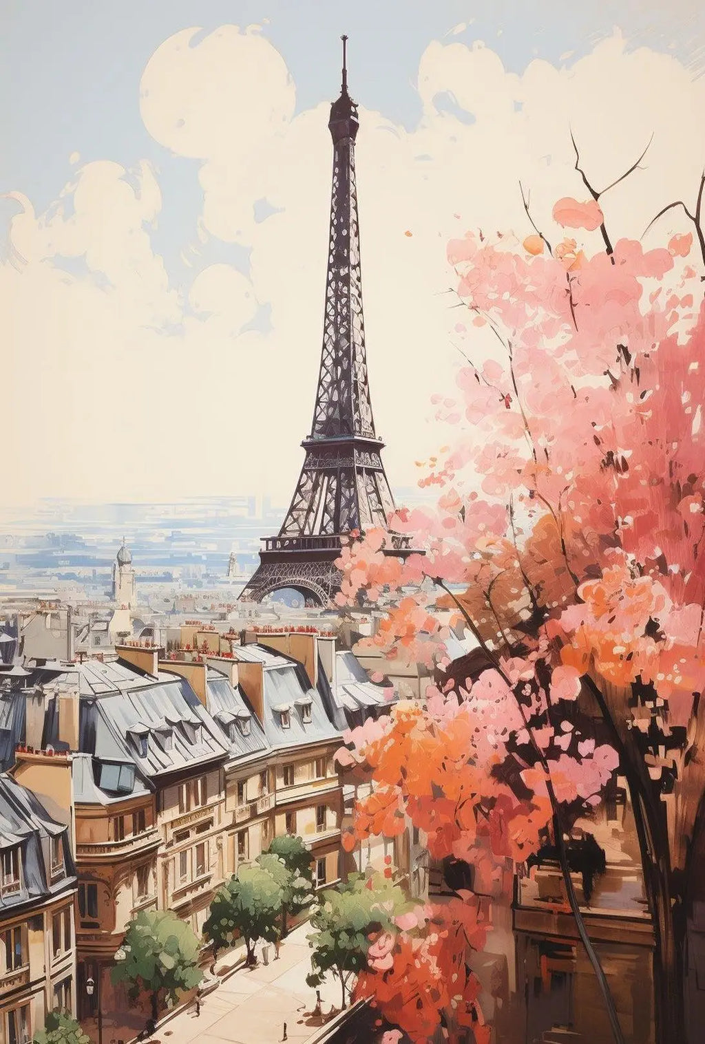 - Striking composition: Tall Eiffel Tower focal point balanced by blooming pink and coral trees and detailed Haussmann-style rooftops—creates depth and a narrative of springtime in the City of Light.