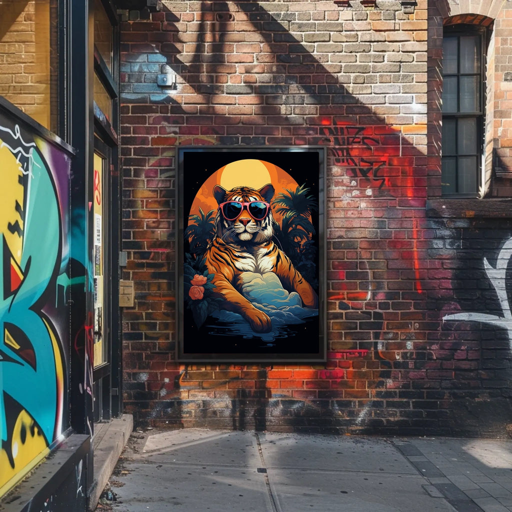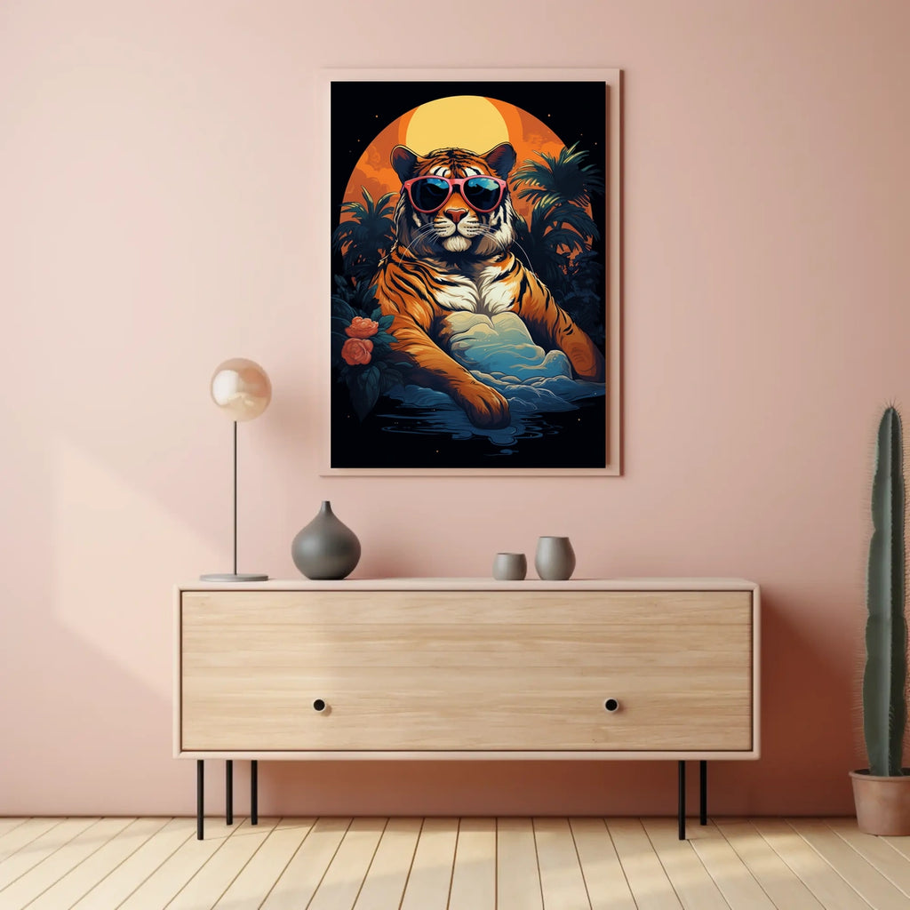 Transform your space with a vibrant, daring stylized tiger poster. This eye-catching design features a tropical setting where a majestic tiger dons playful red sunglasses, blending wild beauty with a pop culture twist. The rising sun or moon in the background bathes the scene in serene hues, vibrant palm trees tower around, evoking a spirited and adventurous vibe. Perfect for adding an exotic yet cool edge to your home decor, it delivers an energetic, laid-back ambiance ideal for modern art enthusiasts and those with a taste for the unique.