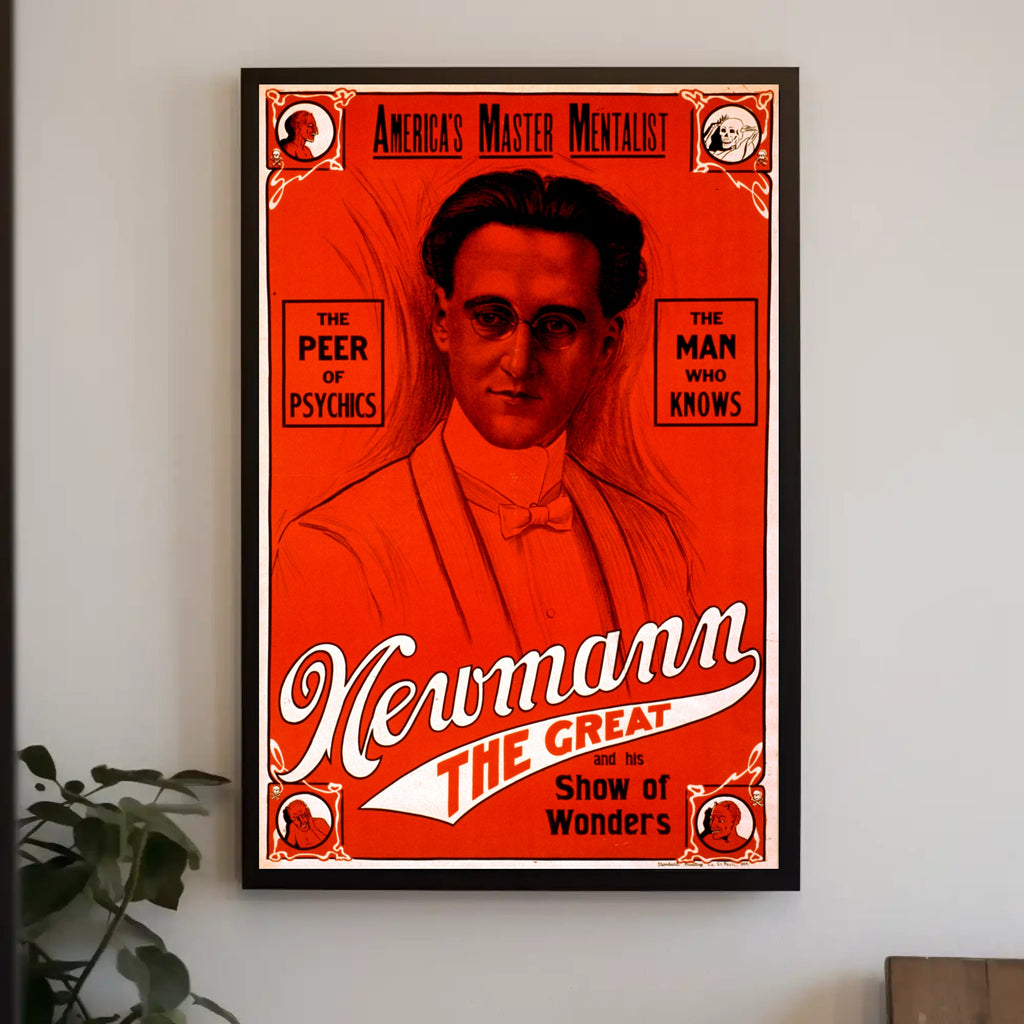 - Authentic vintage typography: Classic lettering — including the sweeping "Newmann The Great" script and boxed slogans like "The Peer of Psychics" and "The Man Who Knows" — evokes the mystery and glamour of historic magic posters.