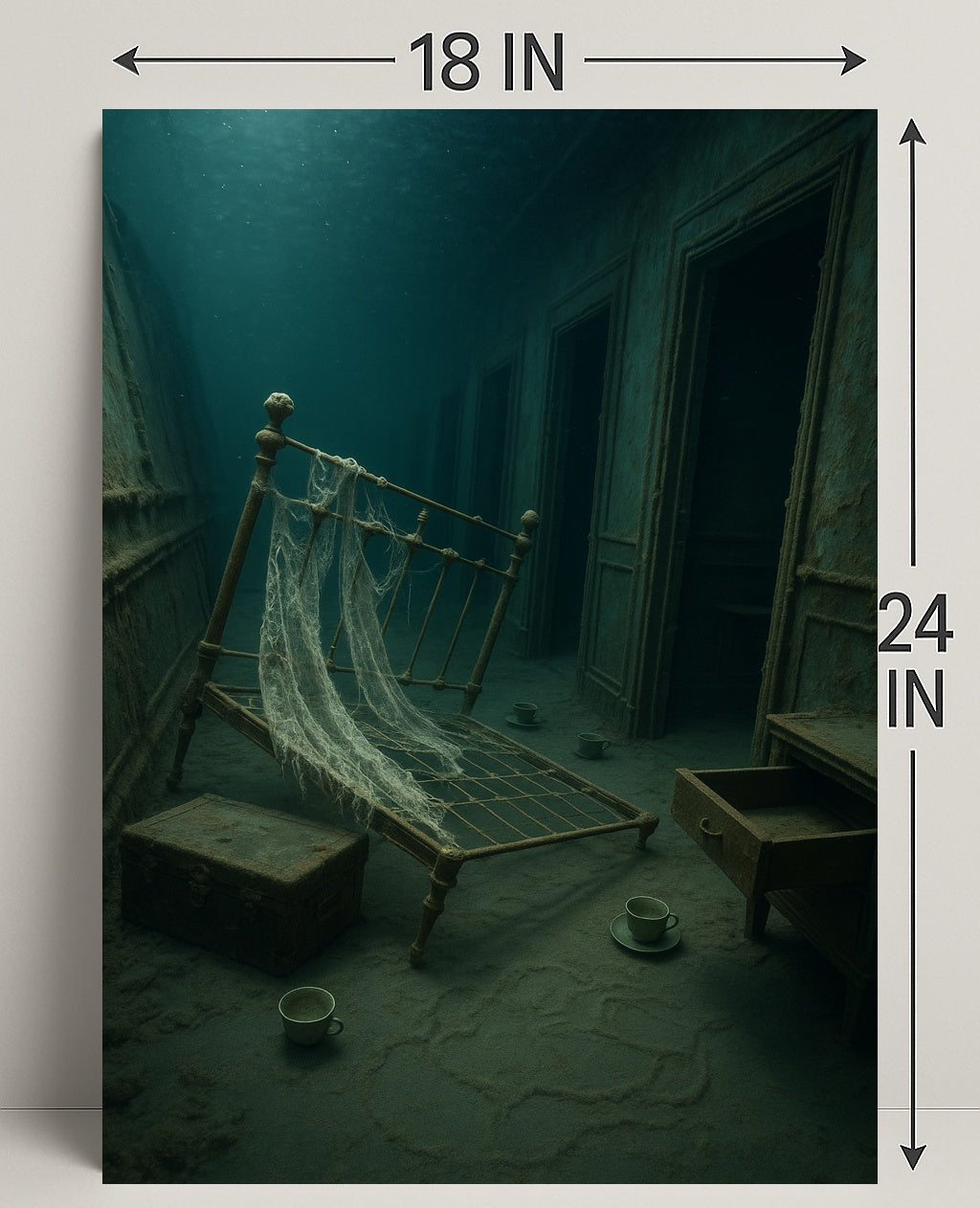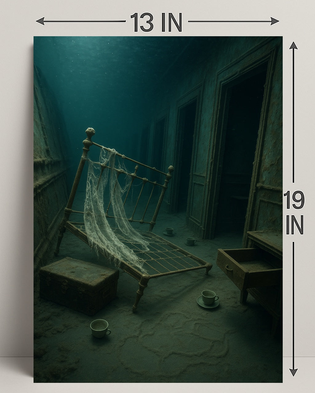Invite a surreal underwater reverie into your home with the Submerged Dreams Poster by PosterGoat. This evocative wall art captures an abandoned, sea‑kissed interior — a rusted iron bedframe draped in ghostly fabric, scattered teacups resting on soft sand, a weathered trunk and open drawer leading down a dim corridor — all bathed in deep teal light that feels both tranquil and uncanny.