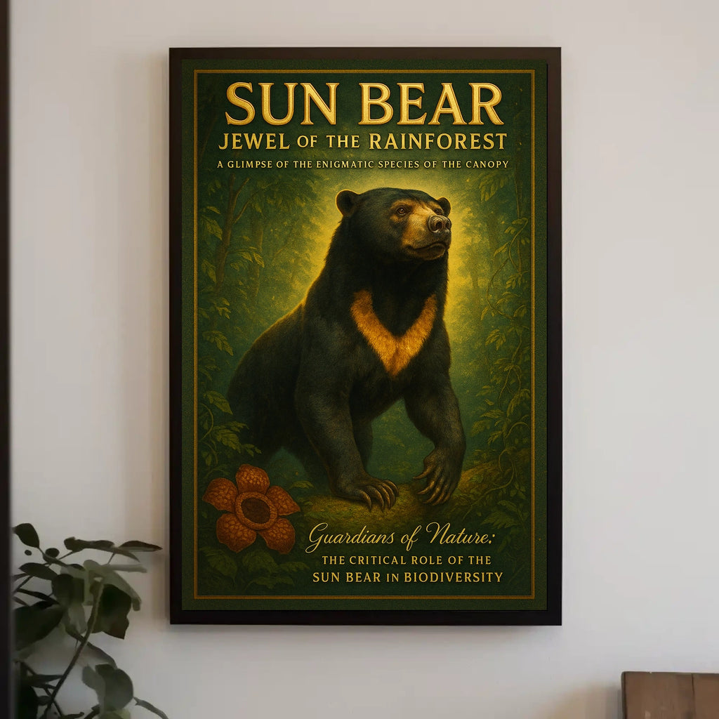 Capture the spirit of the rainforest with the Sun Bear Jewel of the Rainforest Poster. This art print blends real-world scenery with a sun-warmed palette, making it ideal for decor lovers and wanderlust souls seeking a touch of nature in any room. Add color, character, and a hint of adventure to your space with this striking wall art.