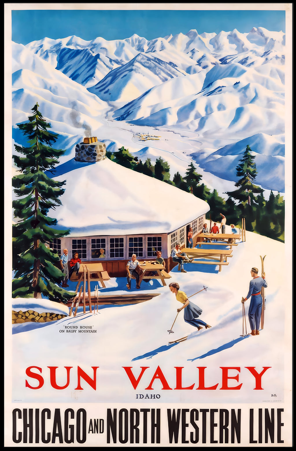 Sun Valley Winter Retreat Poster by PosterGoat brings vintage ski-resort charm to your walls — a crisp, minimalist art print that captures sunlit peaks, a cozy round house perched on the ridge, and skiers enjoying fresh powder against a panoramic mountain valley.