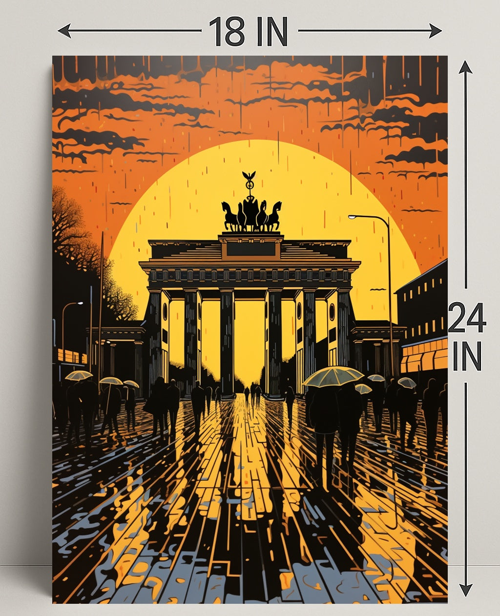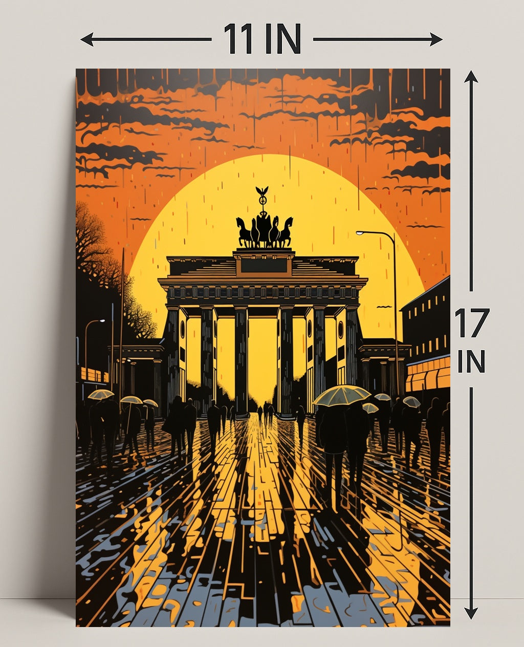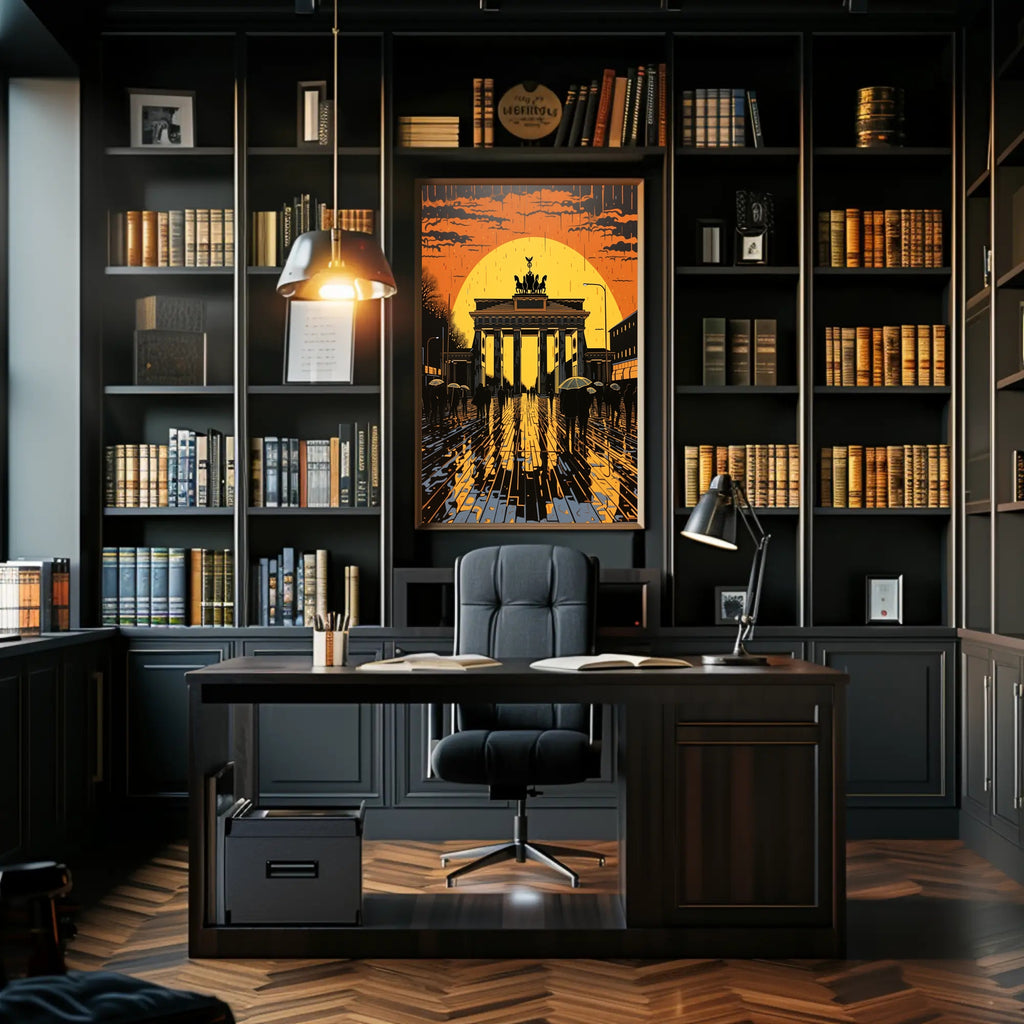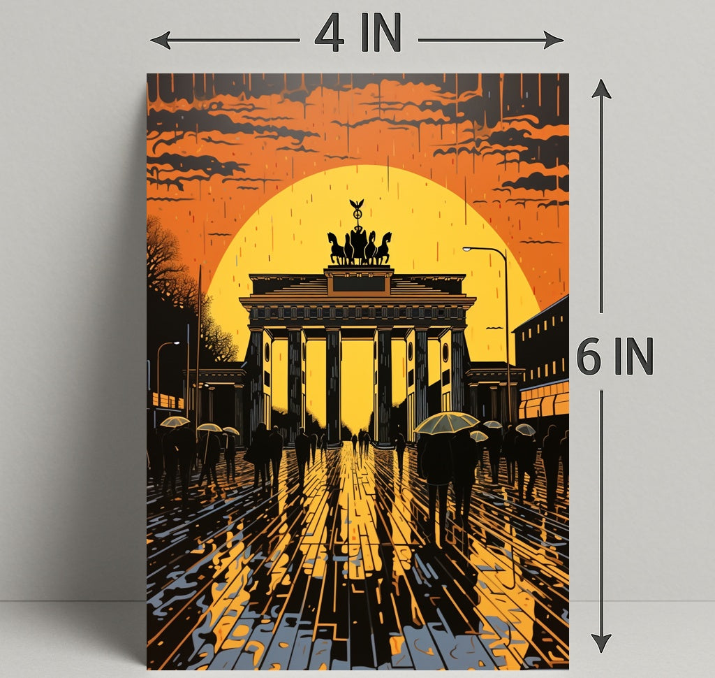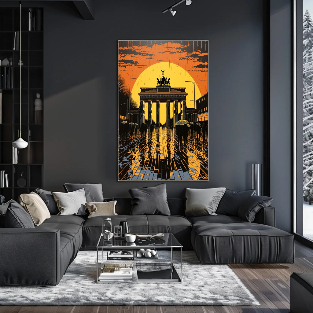 Bring Berlin's most iconic landmark home with the Sunset At The Brandenburg Gate Poster from PosterGoat. This striking print captures a cinematic sunset haloing the Brandenburg Gate, rendered in bold silhouettes, glowing orange and gold tones, and dramatic reflections on wet cobblestones—an evocative piece of wall art that blends travel nostalgia with minimalist, modern design.