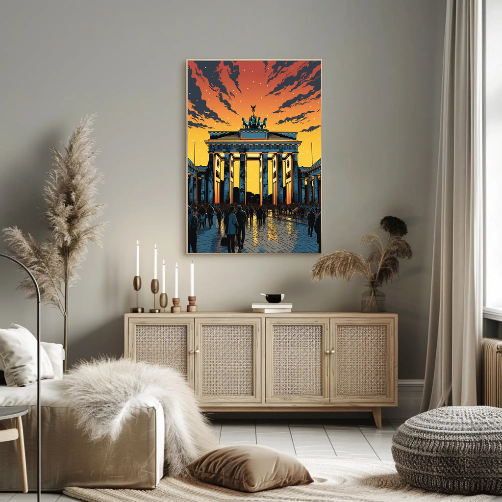 Rendered in warm sunset gradients from golden yellow to deep coral, the artwork highlights the Brandenburg Gate's stately columns and the iconic quadriga silhouette against a dramatic sky. A bustling crowd and glossy, reflective pavement add depth and life to the scene, creating a cinematic, travel-inspired mood that invites conversation and wanderlust.
