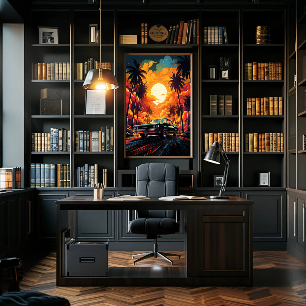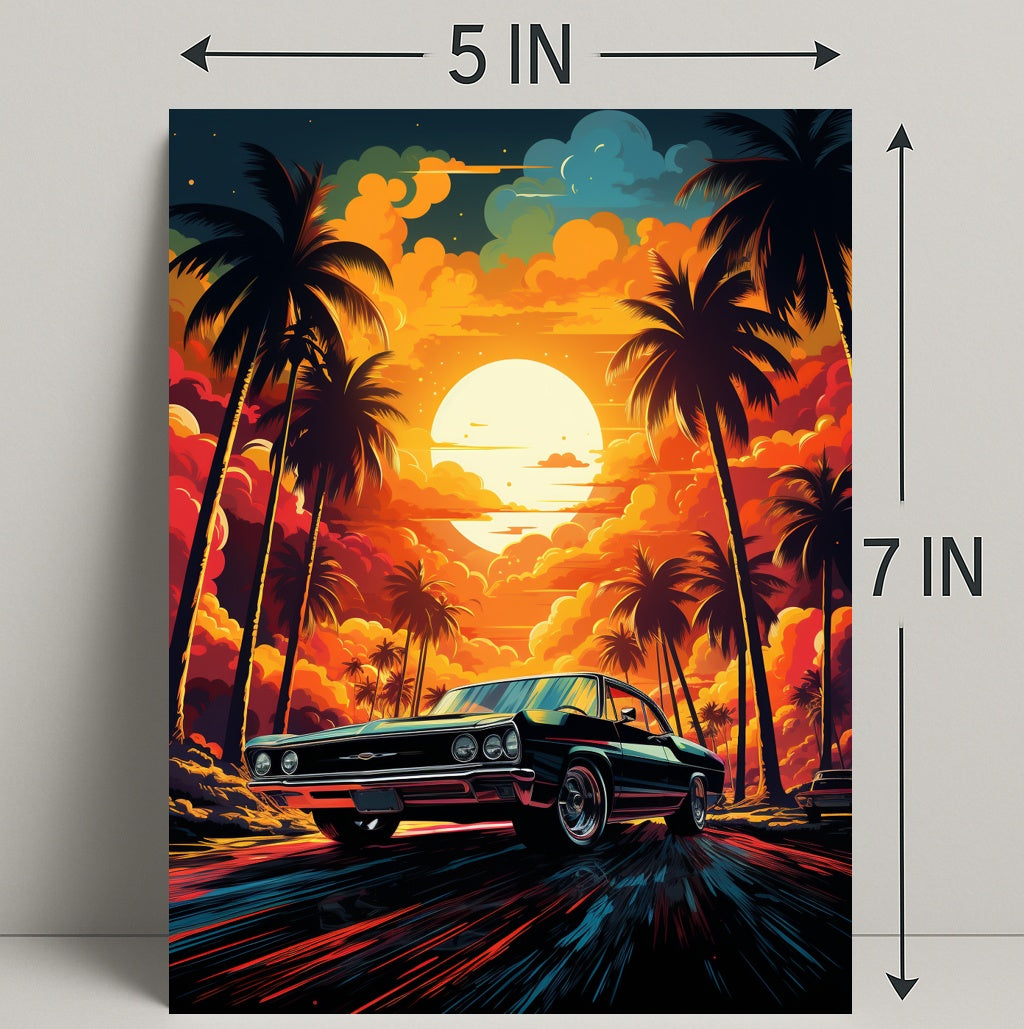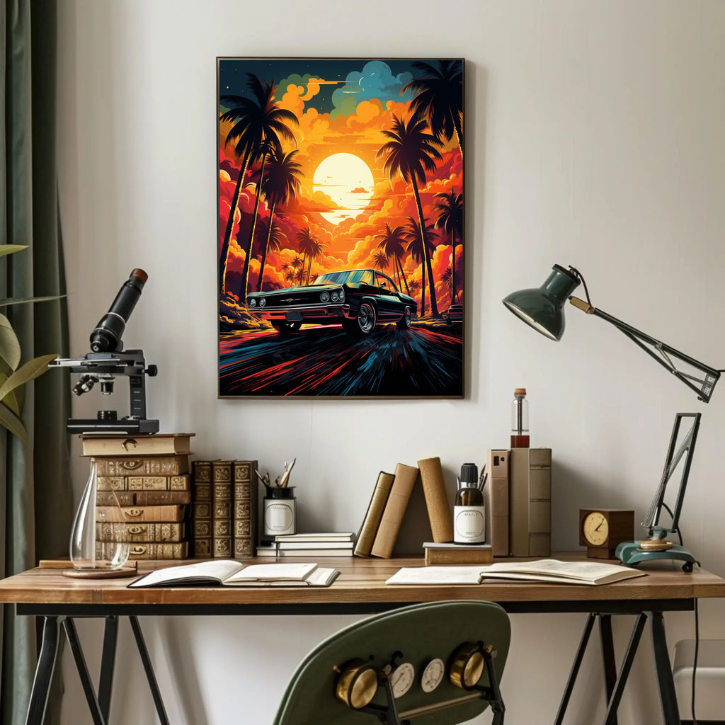 Bring the magic of a golden-hour coastal drive into your home with the Sunset Drive Poster from PosterGoat — a striking, minimalist-inspired piece of wall art that captures a retro car speeding down a palm-lined avenue beneath a towering sun and incandescent clouds.