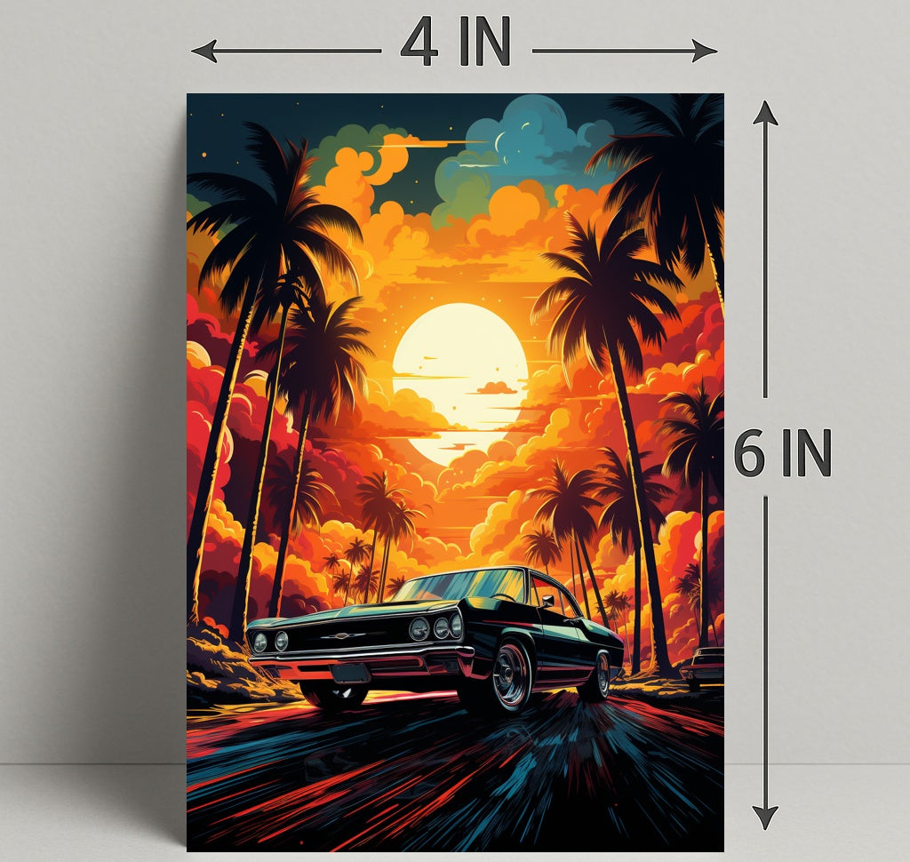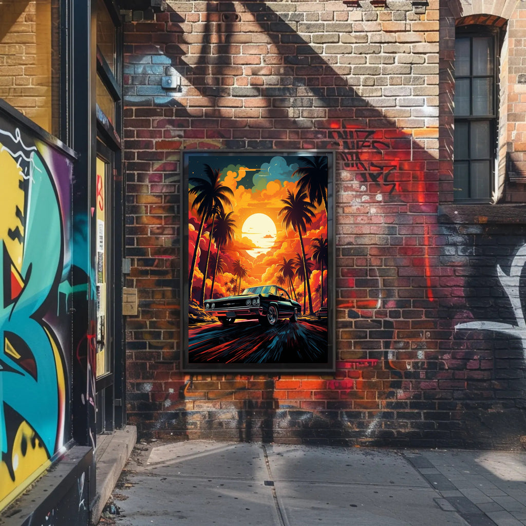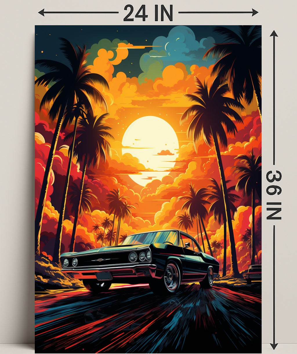 Bring the magic of a golden-hour coastal drive into your home with the Sunset Drive Poster from PosterGoat — a striking, minimalist-inspired piece of wall art that captures a retro car speeding down a palm-lined avenue beneath a towering sun and incandescent clouds.