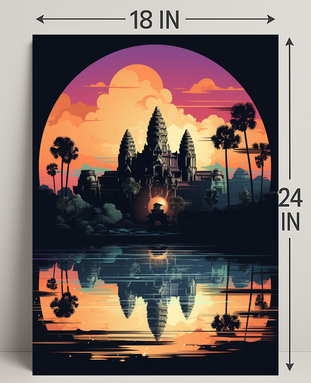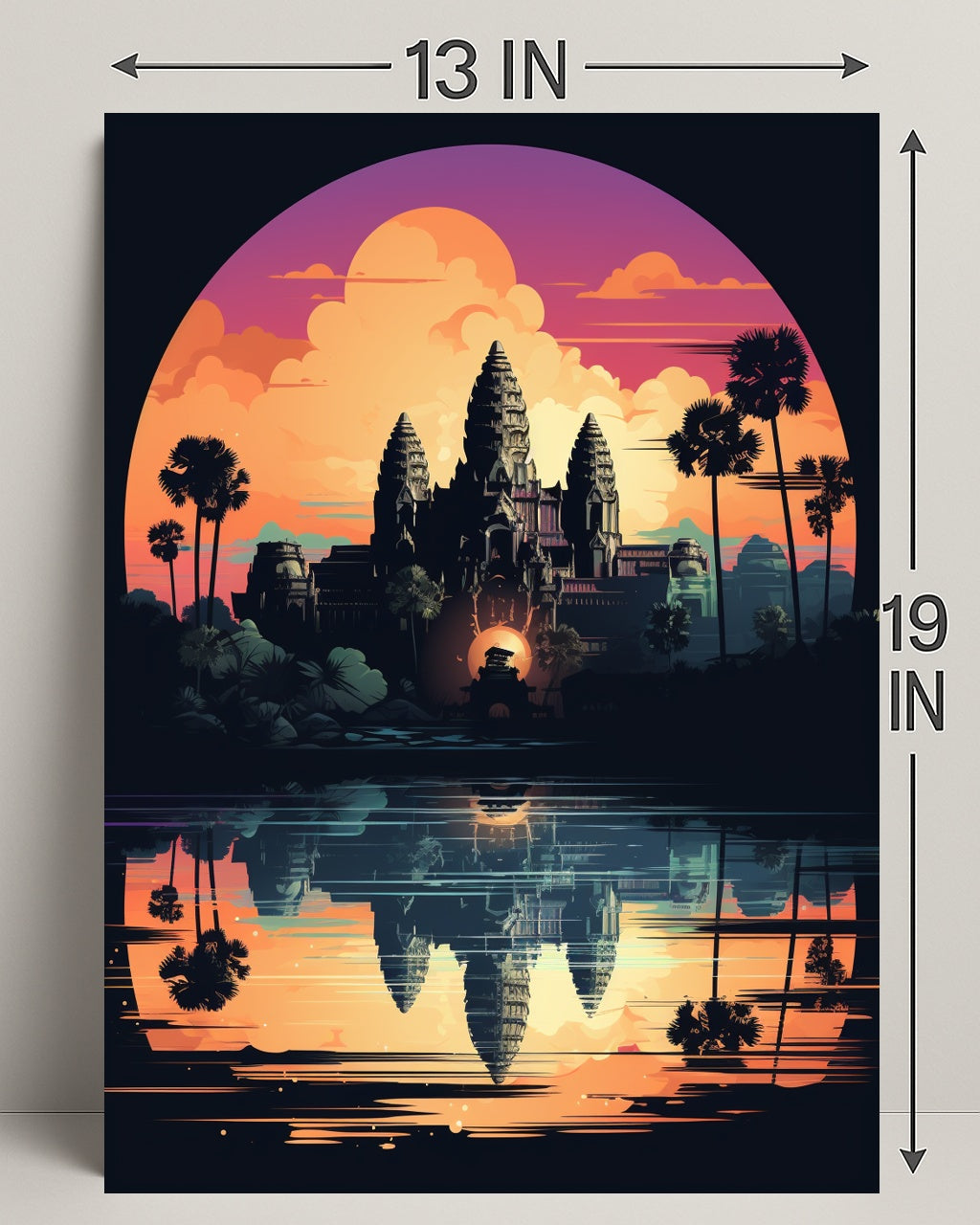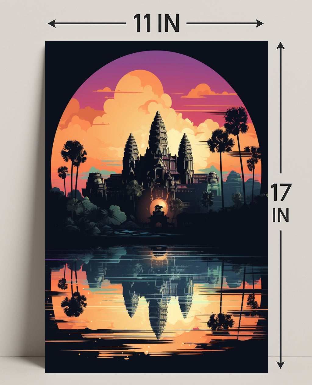 Bring the magic of Southeast Asia into your home with the Sunset Over Angkor Wat Poster from PosterGoat. This minimalist yet richly detailed art print captures Angkor Wat's iconic silhouette against a radiant sunset — warm oranges, soft purples and deep navy contrast to create a striking focal point with its perfect mirror reflection on tranquil water.
