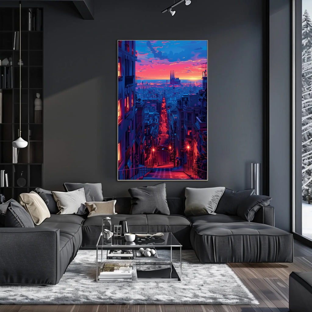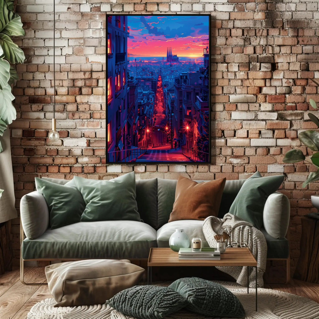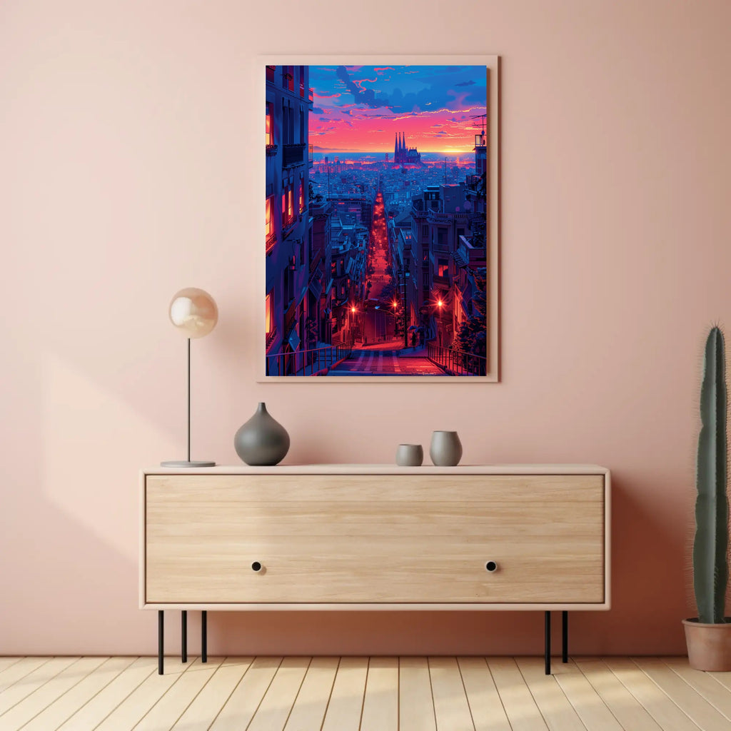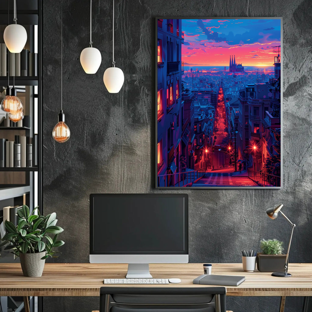 Sunset Over the Cityscape Art Print Poster Decor by PosterGoat captures a cinematic urban twilight in vivid, neon-drenched color—an instant focal point for any home or office wall. This minimalist cityscape poster blends warm sunset hues and cool blue tones to create a dramatic depth that draws the eye down a glowing avenue toward a silhouetted cathedral on the horizon.