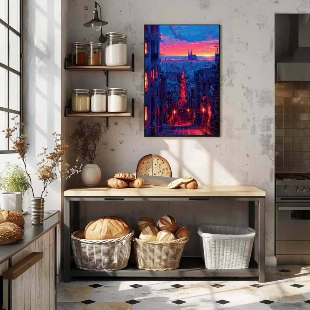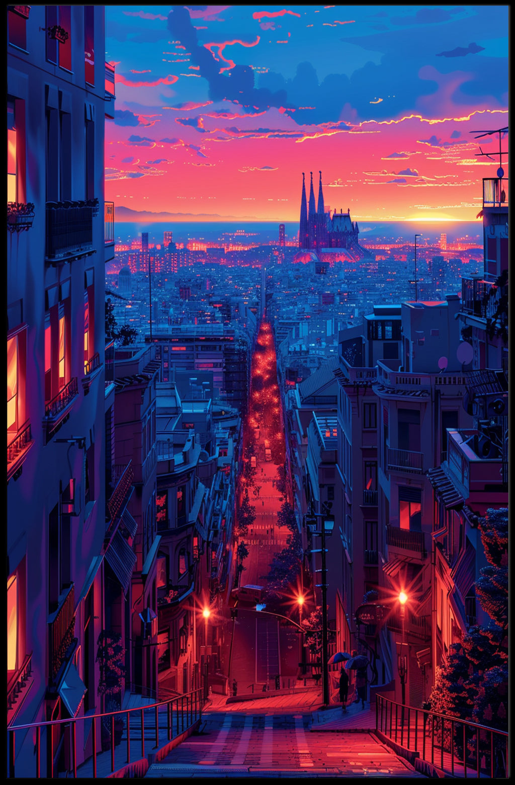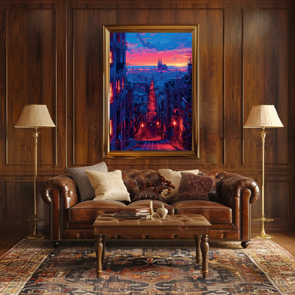Sunset Over the Cityscape Art Print Poster Decor by PosterGoat captures a cinematic urban twilight in vivid, neon-drenched color—an instant focal point for any home or office wall. This minimalist cityscape poster blends warm sunset hues and cool blue tones to create a dramatic depth that draws the eye down a glowing avenue toward a silhouetted cathedral on the horizon.