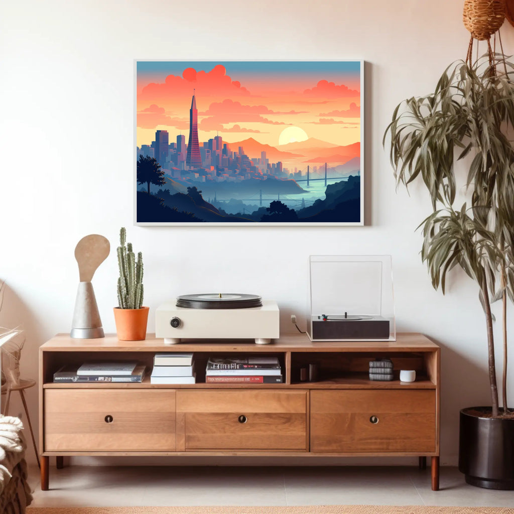 Bring the glow of golden hour into your home with the Sunset Over the Cityscape Poster from PosterGoat. This Pop Art–inspired print captures a vibrant sunset spilling warm pinks and oranges across a dramatic urban skyline, framed by layered hills and iconic suspension bridges. The stylized silhouettes and soft atmospheric depth create a calming yet energizing focal point for living rooms, offices, cafés, or any wall that needs personality.