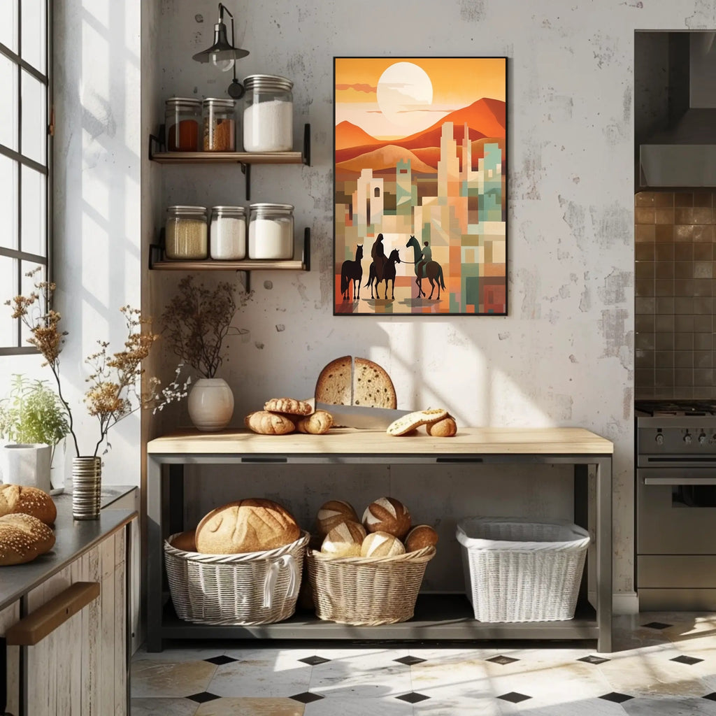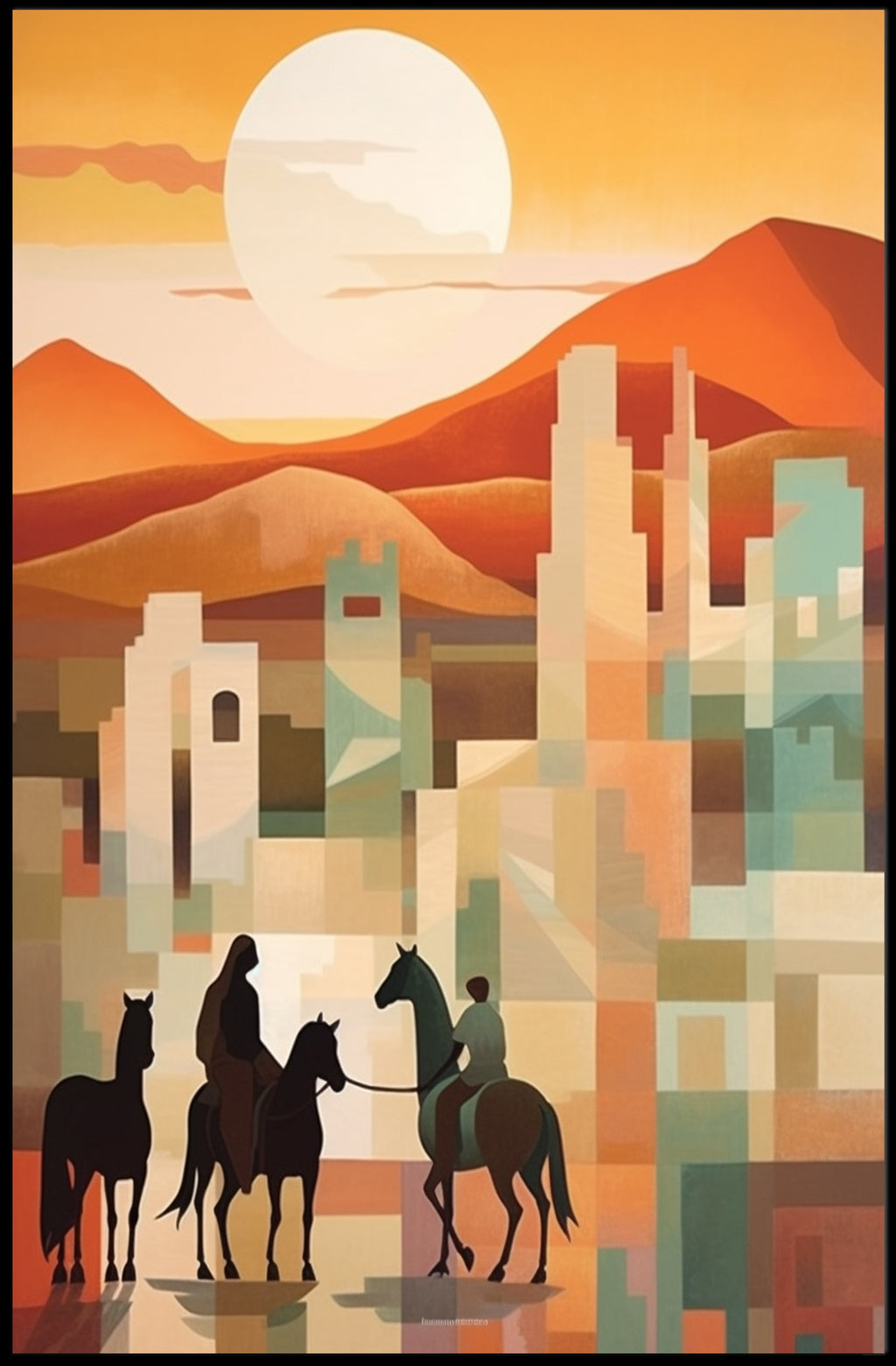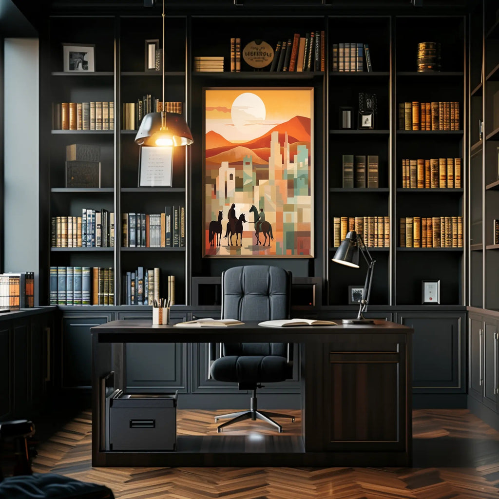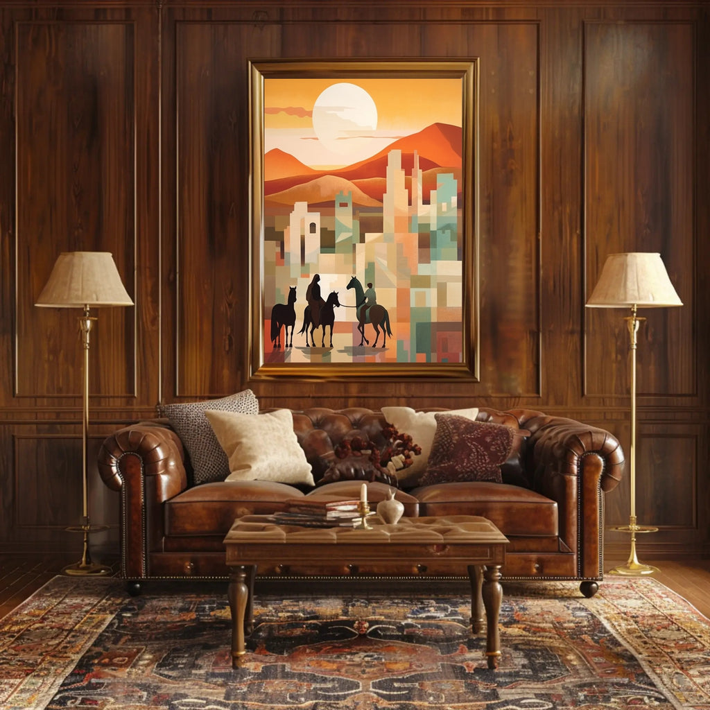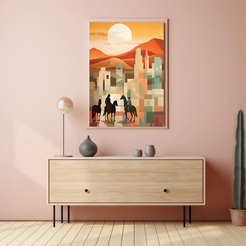 Sunset Riders in a Desert Cityscape Poster
