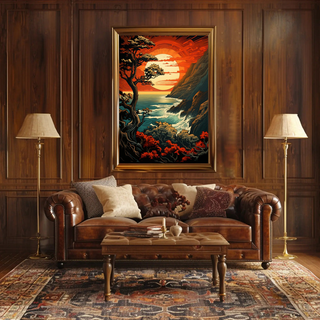 Immerse your space in warm, cinematic calm with the Sunset Serenity Poster by PosterGoat — a striking piece of wall art that blends minimalist composition with scenic, illustrative detail. This high-impact poster captures a towering sun dipping behind rugged coastal cliffs, crashing teal waves, and wind-sculpted trees framed by vivid orange and crimson foliage for a serene yet dramatic focal point.