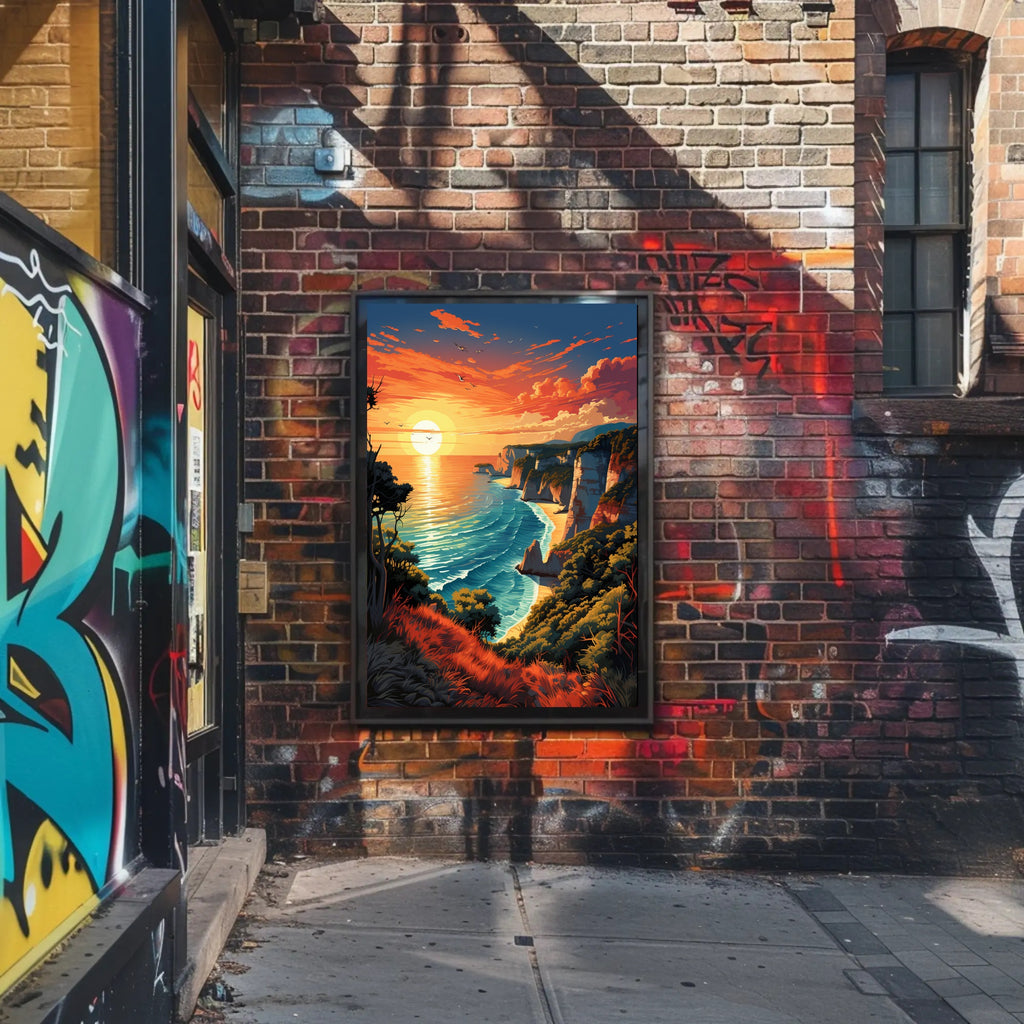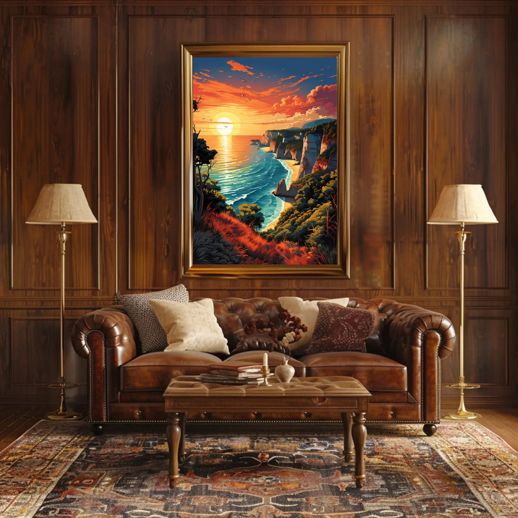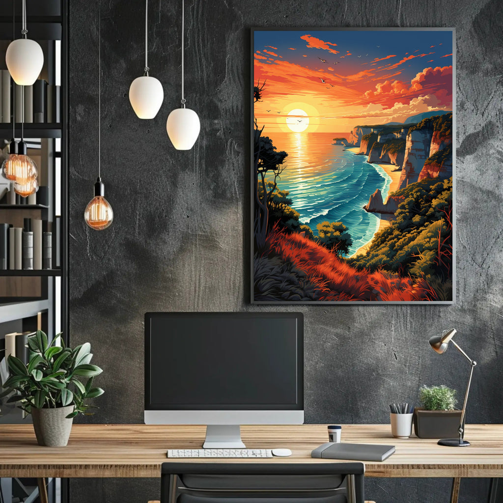 Scenic Beauty: Featuring a breathtaking sunset over a serene coastline, this poster brings the allure of nature indoors.