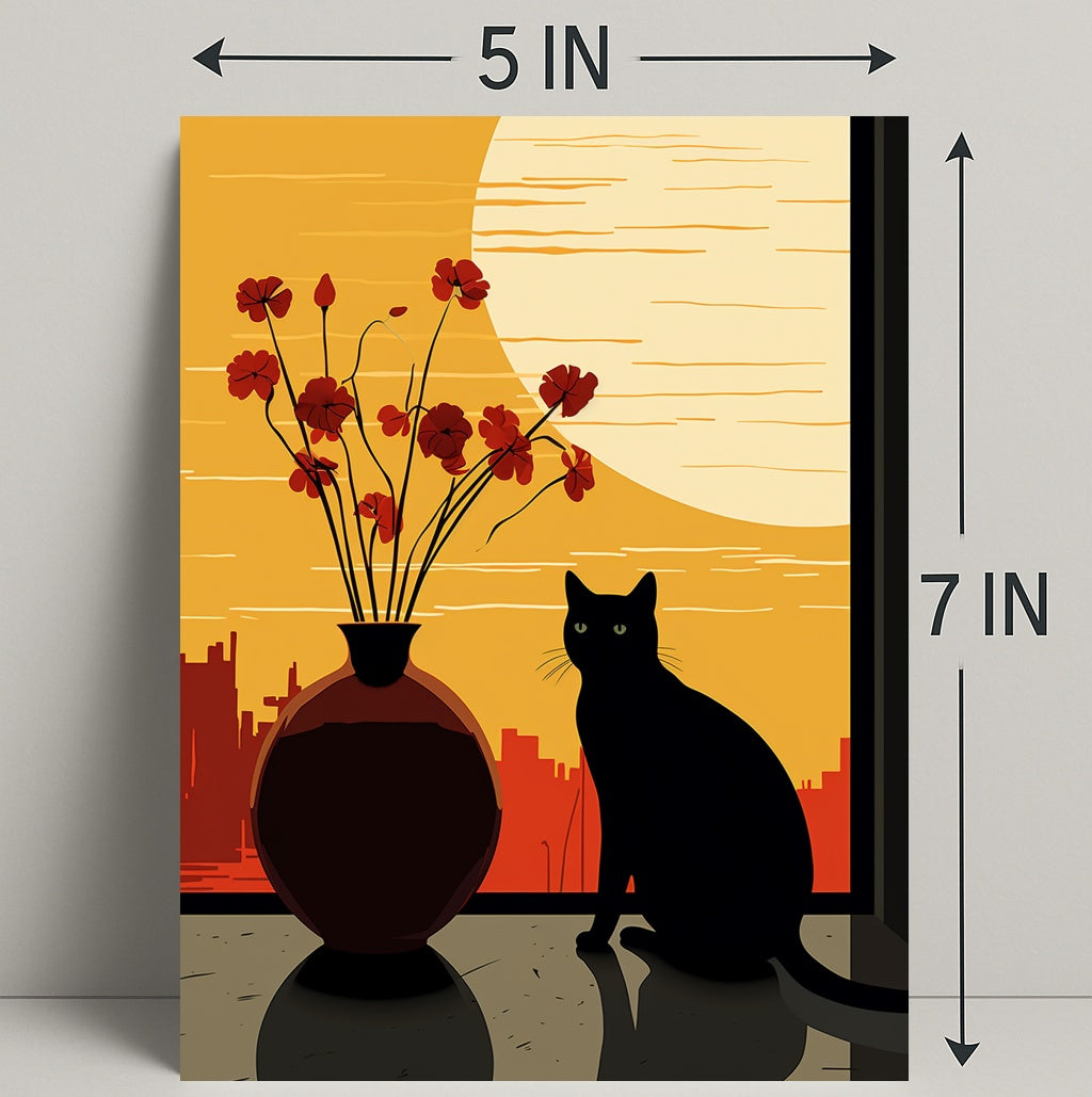 Emotive visual story: The contrasting silhouette of the cat and vase against the warm sunset gradient invites reflection and calm — perfect for living rooms, bedrooms, or office walls.