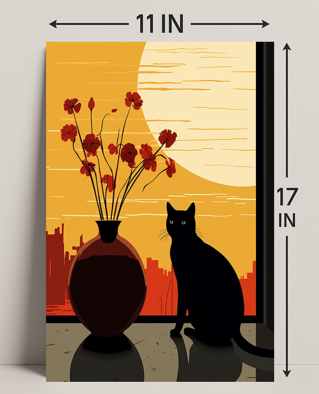 Bring the calm glow of dusk into your home with the Sunset Serenity Poster from PosterGoat — a minimalist, scenic wall art piece that marries simple shapes and warm tones into an instantly soothing focal point. The striking composition features a black cat silhouette perched beside a rounded vase of delicate red blooms, set against a dramatic oversized sun and a stylized city skyline — a design that evokes quiet evenings, wanderlust, and cozy interiors.