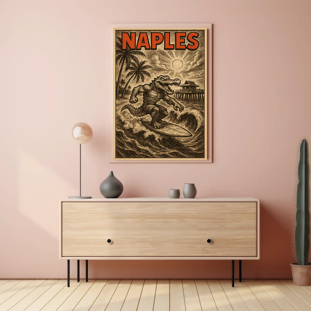 - Detailed design highlighting the surfing alligator against Naples' sun-kissed shoreline