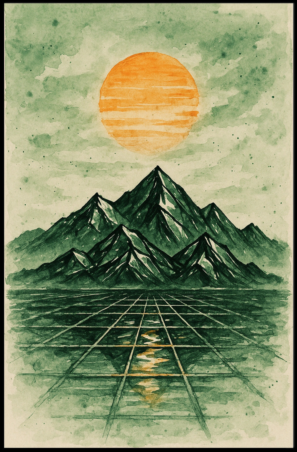 Celebrate the beauty of Surreal Abstract Landscape with Futuristic Touches Artistic Poster with this timeless wall art. Step into a realm of imagination where art meets innovation. A series of dark mountains rise majestically against a vibrant greenish sky, dominated by a striking orange sun. This celestial body illuminates the landscape, creating a mesmerizing play of light and shadow. The foreground features a reflective surface adorned with a grid pattern, adding a futuristic flair that contrasts beautifully with the traditional watercolor techniques utilized. Enhanced digitally, this piece offers an ethereal, dreamlike quality, encapsulating tranquility and otherworldly charm in a harmonious blend of natural and digital artistry.