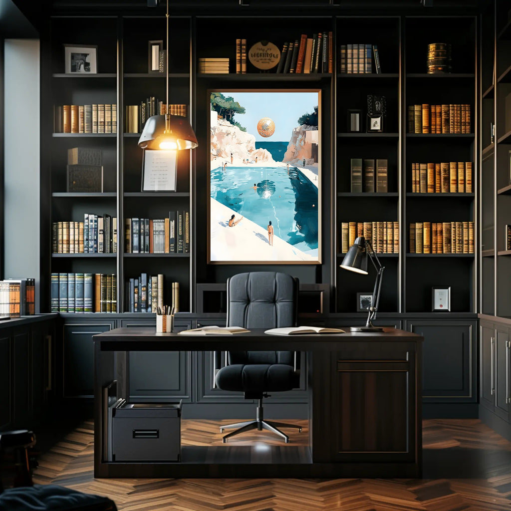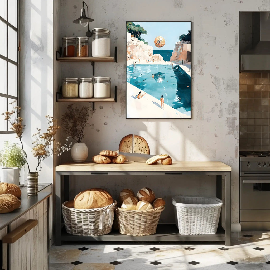 Transform any room with this serene, minimalist Surreal Beachscape Poster from PosterGoat. The art print blends painterly brushstrokes, a tranquil turquoise pool, craggy limestone cliffs and an otherworldly floating orb to create a scenic, travel-inspired focal point that sparks imagination and calm.