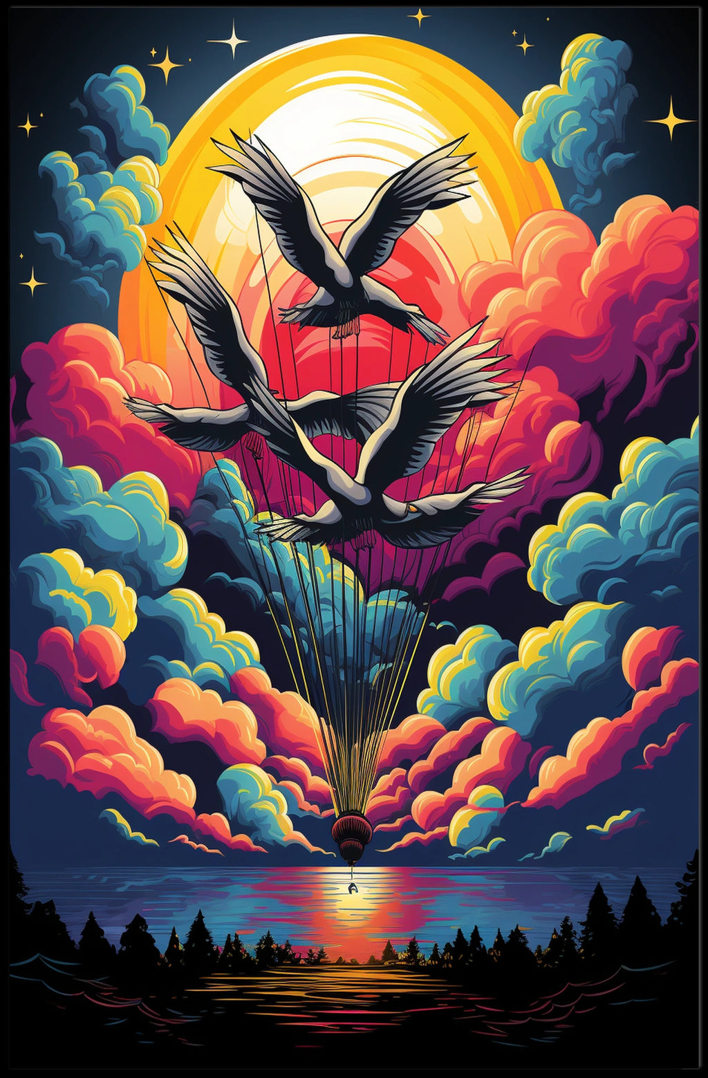 Celebrate the beauty of Surreal Birds and Balloon Adventure Art Poster with this timeless wall art. Experience a journey beyond the ordinary as birds tethered to a hot air balloon glide through a sky ablaze with vibrant, multicolored clouds. A dramatic backdrop of a setting or rising sun casts a warm glow over the landscape, reflecting on a serene body of water and silhouetting a distant forest.