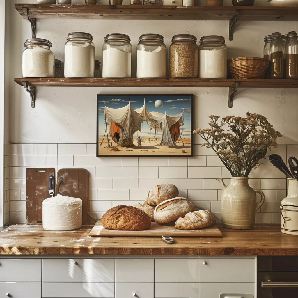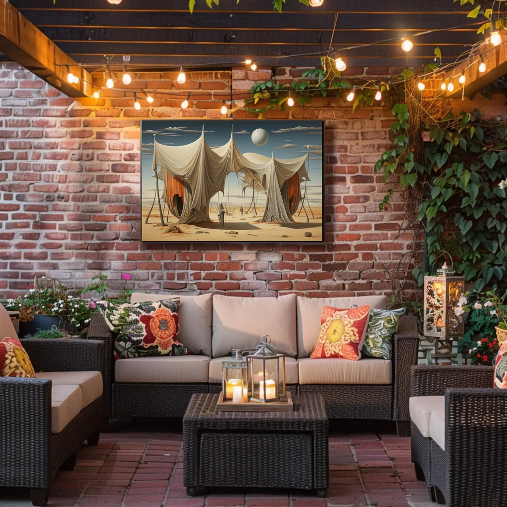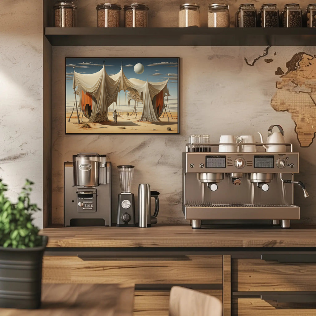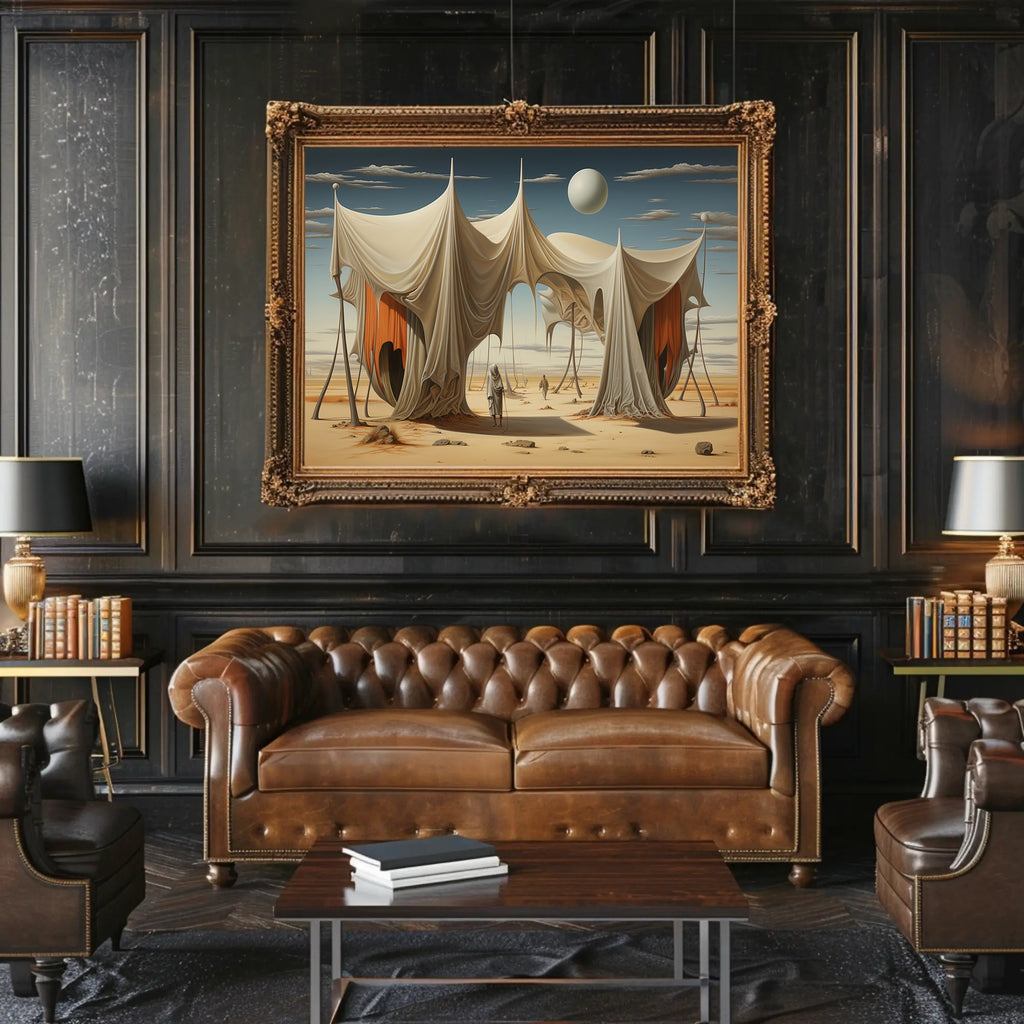 This captivating poster transports viewers to an otherworldly desert landscape, where large, draped fabric structures resemble tent-like canopies, creating an intriguing blend of the organic and the architectural. The enigmatic scene is enhanced by a vast celestial sphere dominating the sky, adding to the surreal atmosphere. In the foreground, robed figures wander this ethereal terrain, inviting the viewer to join the exploration of this distant, abstract world. Ideal for sci-fi enthusiasts and art lovers alike, this piece melds imagination with stunning visual artistry, offering a glimpse into an alternate desert reality.