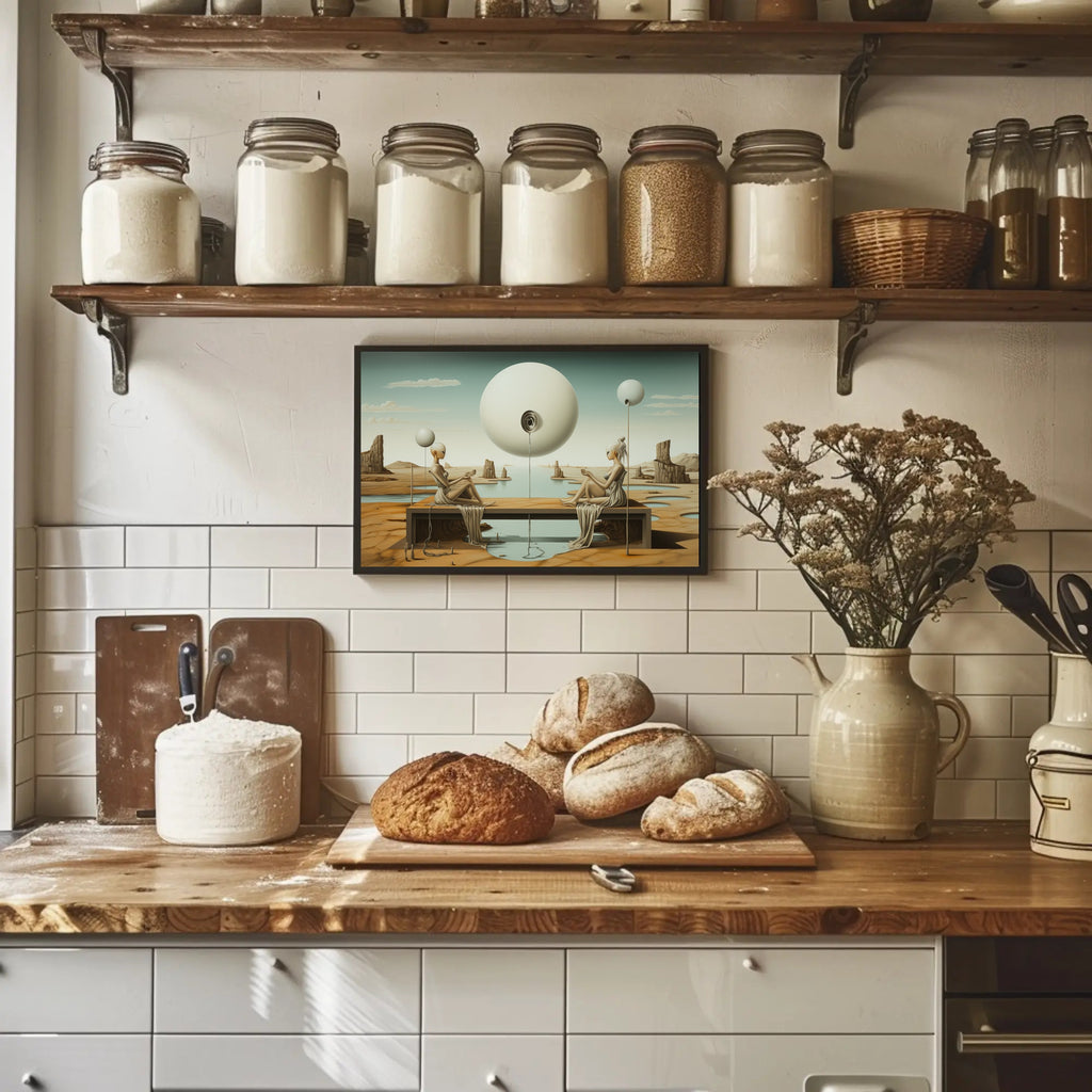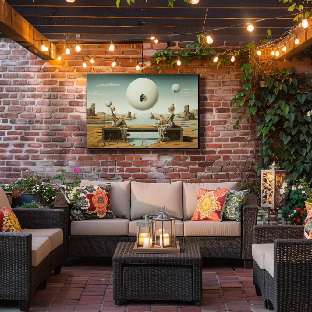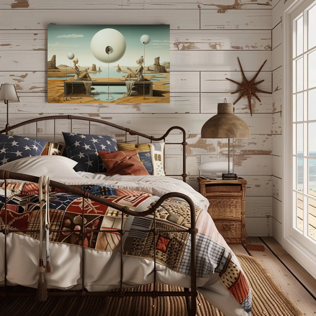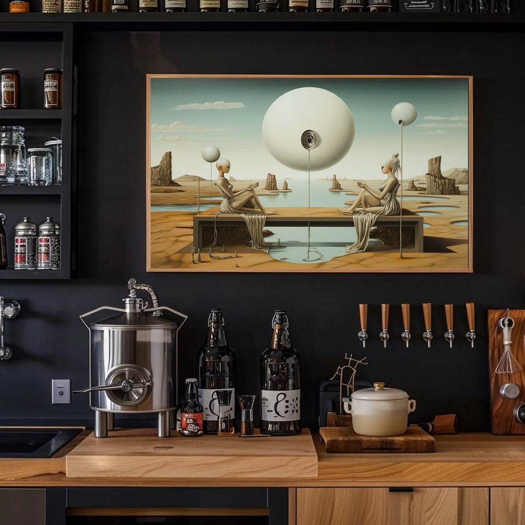 Transport your space to a dreamlike frontier with the Surreal Desert Spheres Futuristic Sci‑Fi Poster by PosterGoat. This evocative print captures two enigmatic humanoid figures seated on a stone bench beneath oversized floating spheres, suspended above a still desert inlet — a composition that blends surrealism, sci‑fi atmosphere, and contemplative modern art into a single striking visual.