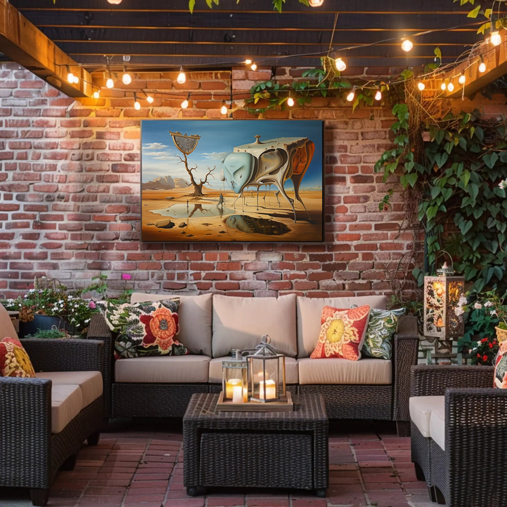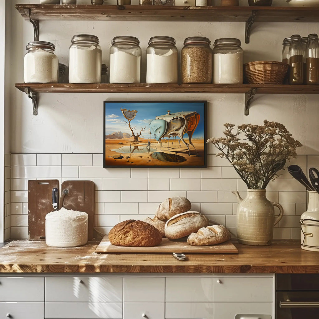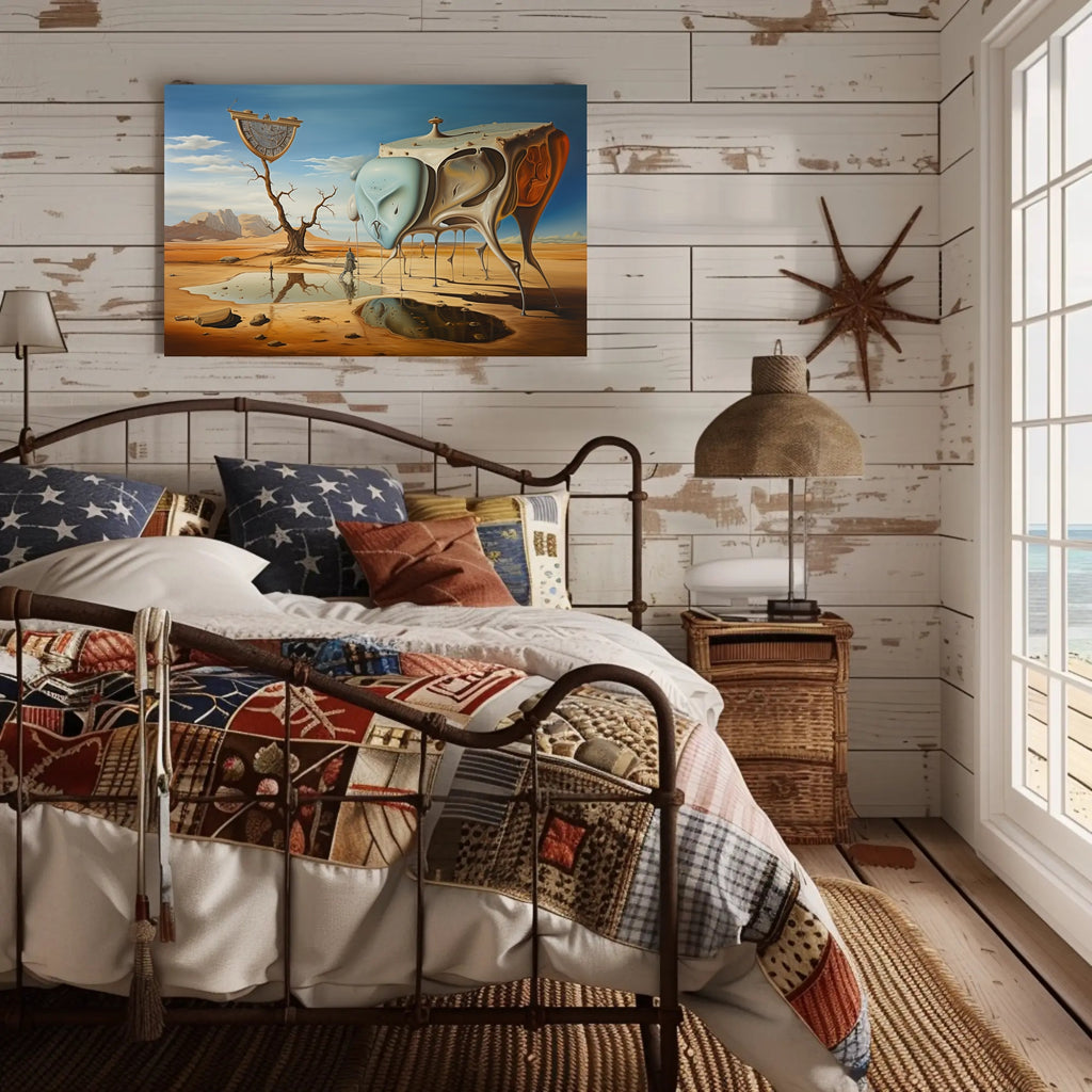 Step into a realm of imagination with this captivating poster depicting a surreal desert landscape. The central focus is an abstract, organic structure, perched on thin, extended legs, which towers over the barren terrain. Nearby, a twisted, leafless tree holds a melting, clock-like object, adding a touch of whimsy and intrigue. The reflective qualities of a nearby pool enhance the dreamlike atmosphere, casting an eerie yet fascinating aura. In the distance, rugged rocky formations complete the otherworldly scene. This poster is a perfect conversation piece for art enthusiasts and dreamers alike.