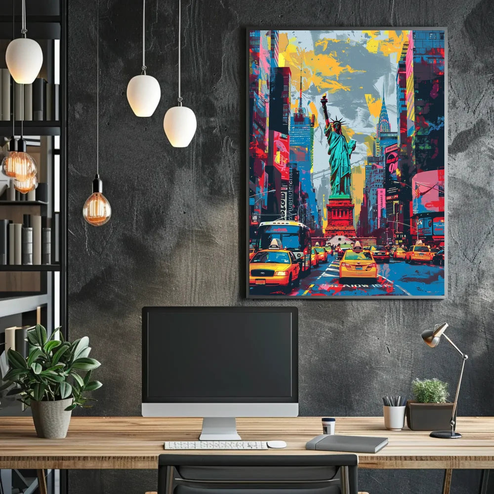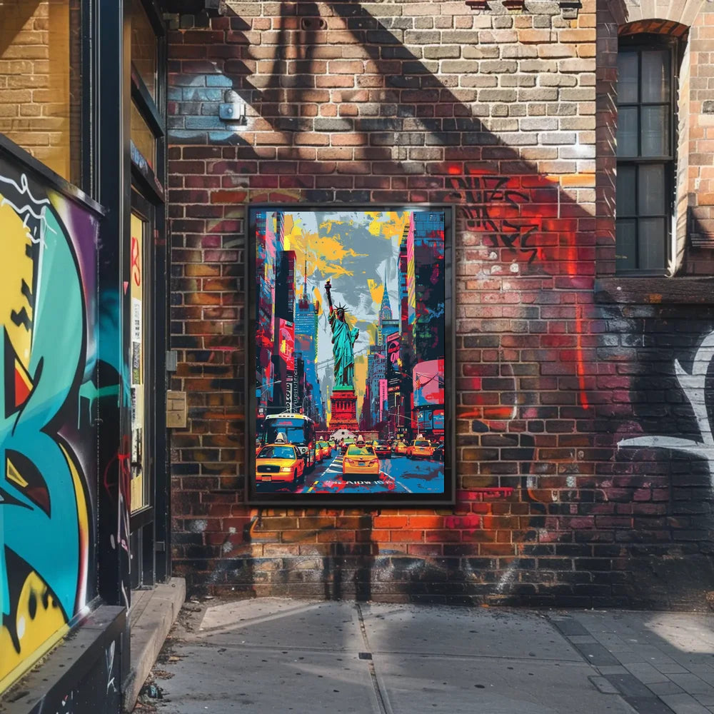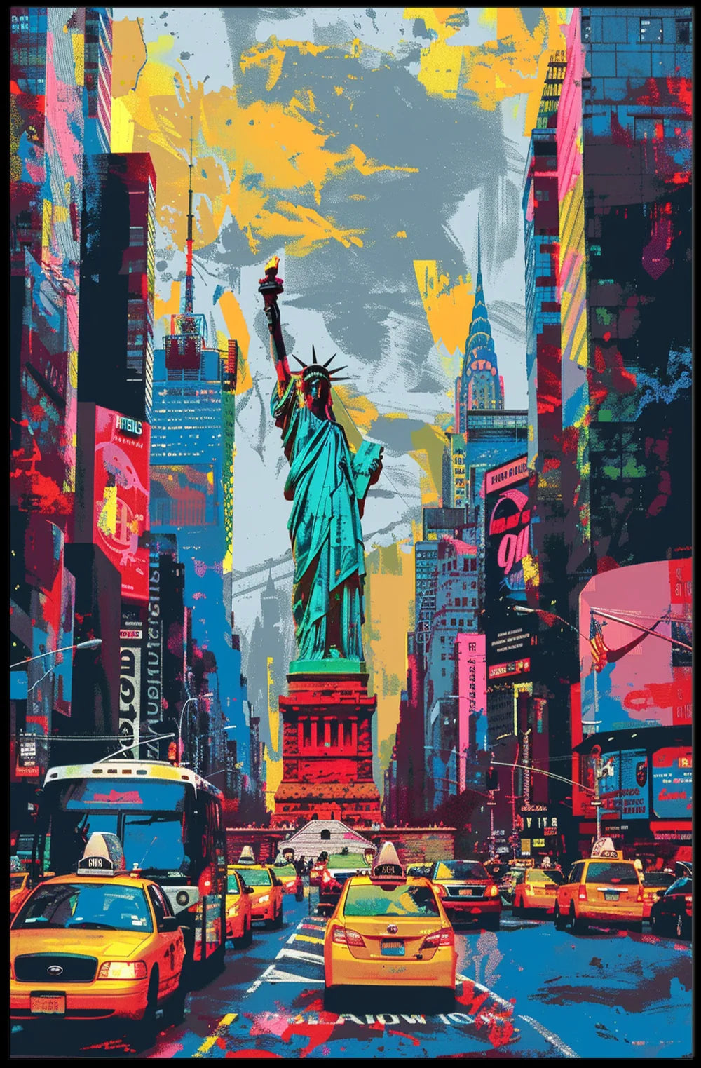 Experience the vibrant energy of New York City with this stunning poster, where the iconic Statue of Liberty takes center stage in a surreal urban setting. Set amidst the bustling streets of Times Square, the scene is alive with yellow taxis and towering skyscrapers, including the renowned Chrysler Building. This artwork's bold, splashy colors and abstract brushstroke effects evoke a modern pop art style, capturing the city's dynamic essence. Perfect for art lovers and city enthusiasts, this piece brings the lively spirit of NYC into any space, offering a unique blend of classic landmarks and imaginative artistry.