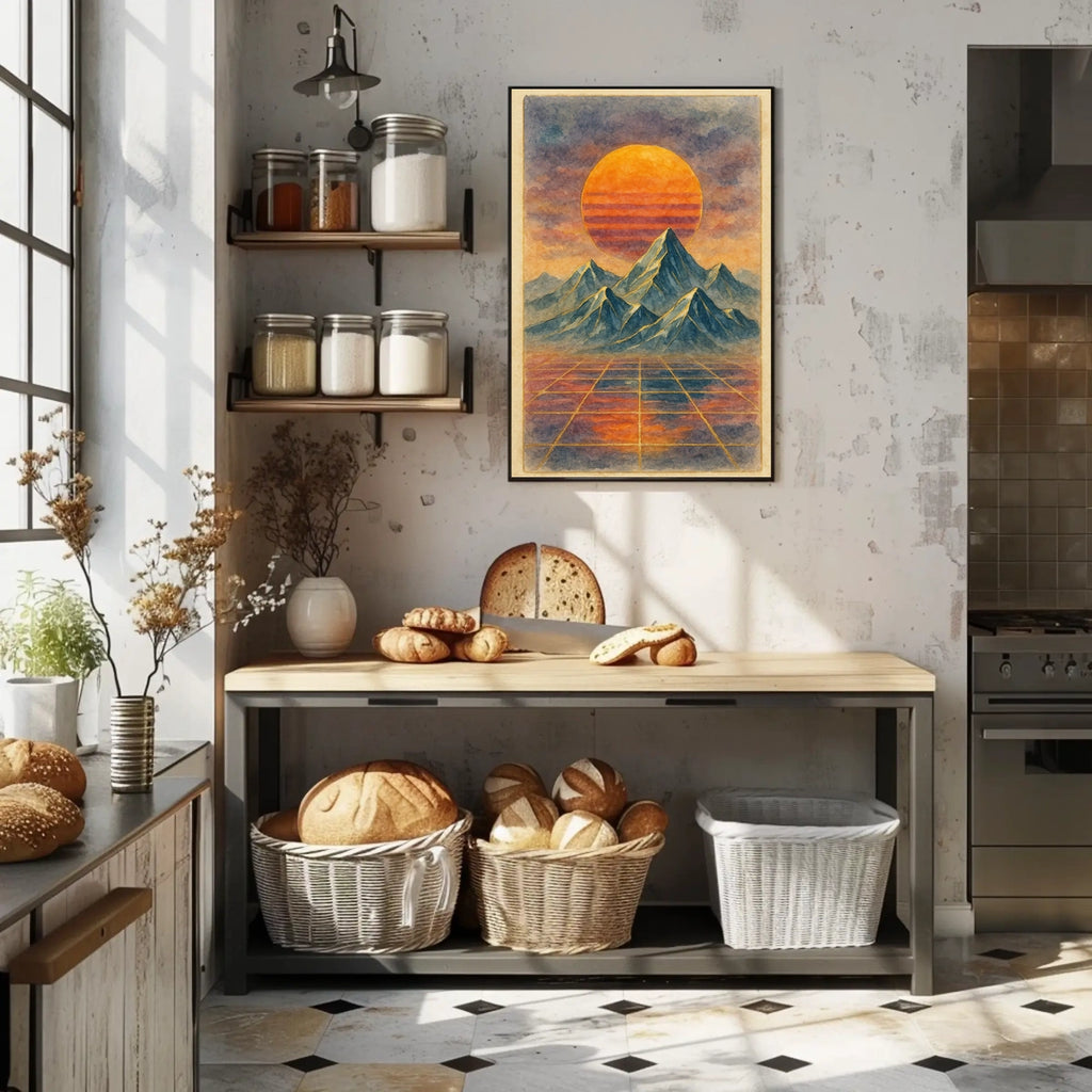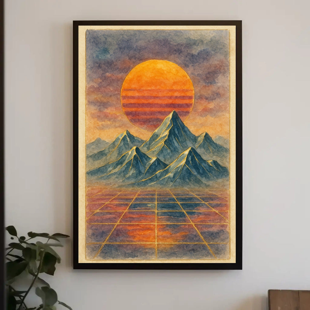 Experience a surreal blend of vintage and futuristic artistry with this captivating poster. The scene unfolds with a large, vibrant sun, either setting or rising, casting warm orange and red hues against jagged, stylized mountains. The sun's horizontal stripes create a striking contrast with the cooler blues and grays of the mountains, adding to its dynamic allure. In the foreground, a grid-like pattern, reminiscent of classic 80s sci-fi, stretches across the ground, reflecting the vibrant sky. This imaginative artwork is perfect for those who appreciate retro-futurism and nature-inspired surrealism, adding a bold yet serene touch to any space.