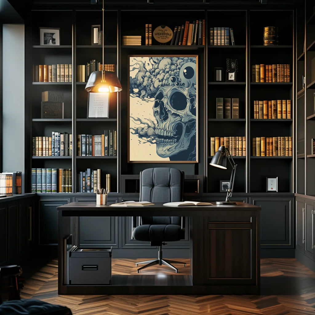 Celebrate the beauty of Surreal Skull Art Poster with Vintage Eerie Design. Dive into the realm of the surreal with this captivating poster, showcasing a meticulously detailed illustration of a human skull. Swirling clouds and smoke envelop the skull, creating an ethereal atmosphere, while exaggerated eyeballs add a touch of bizarre intrigue. The limited color palette of blues and off-whites enhances the vintage and fantastical mood, making it a perfect piece for those who appreciate the mysterious and otherworldly. This artwork seamlessly blends themes of death and the supernatural, offering a unique visual experience that sparks curiosity and conversation.