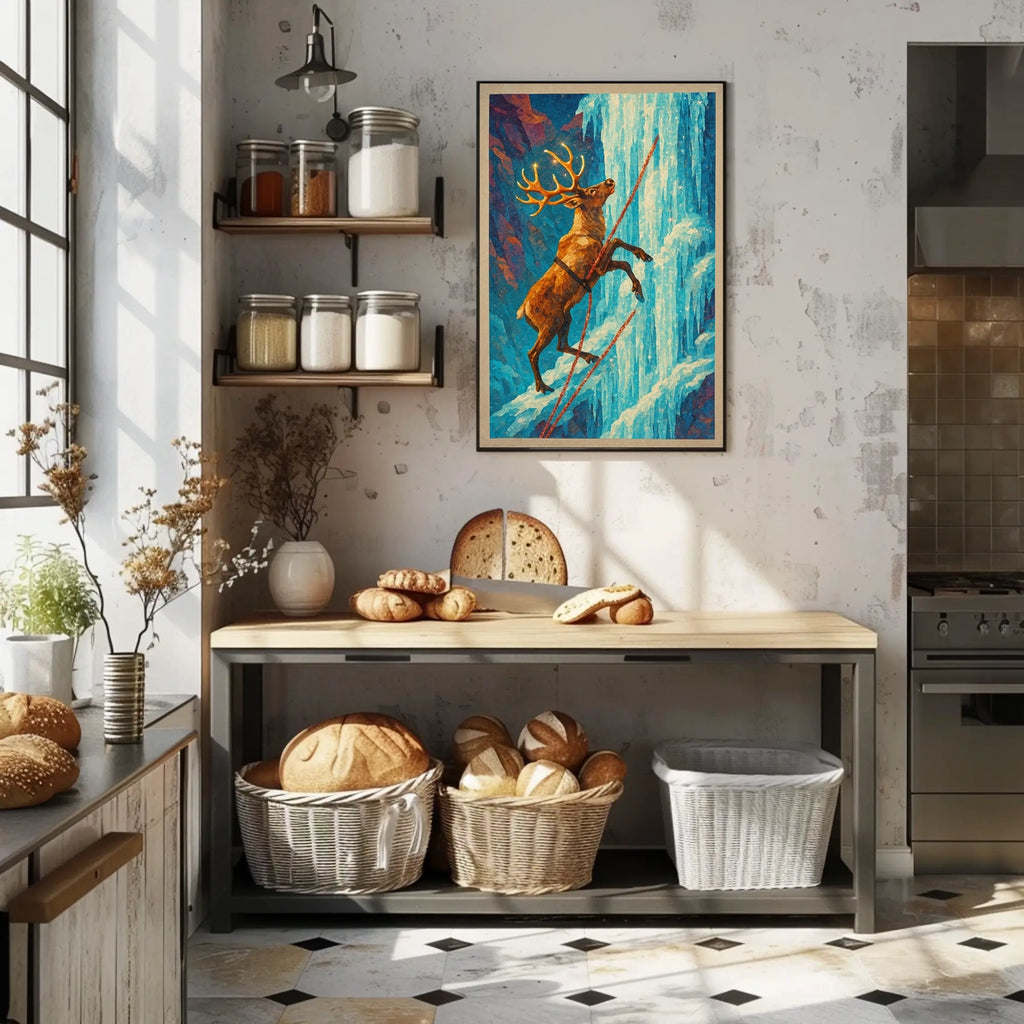 Elevate your space with a bold color palette and a scene that sparks imagination. This surreal stag poster is perfect as vibrant wall decor for living rooms, studios, classrooms, or offices, inviting viewers to explore a magical wildlife moment where fantasy and nature collide.
