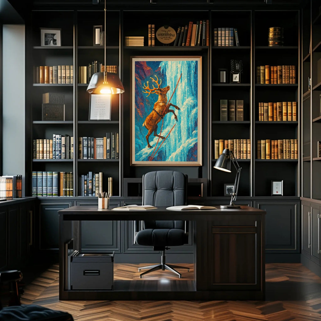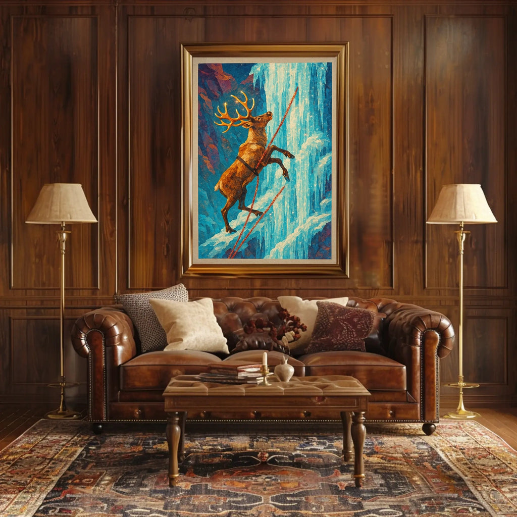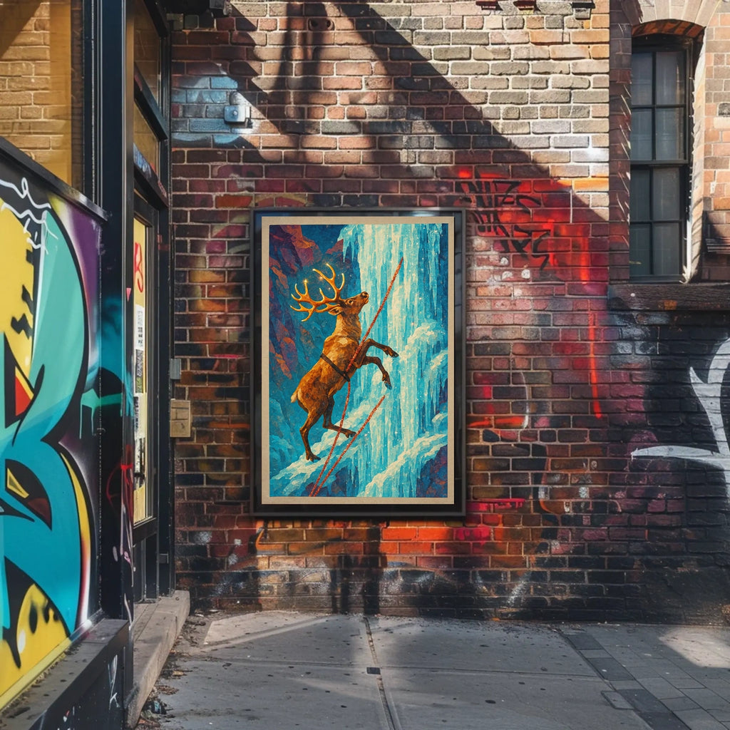 Surreal Stag Adventure Fantasy or Mythology Poster captures the beauty of a mythical expedition, where nature meets fantasy. This timeless wall art showcases a majestic stag on a daring adventure, climbing a vivid blue ice waterfall. The stag is equipped with climbing gear, and its glowing antlers cast a magical light over the landscape, framed by dramatic rock formations in rich blues and oranges. This modern and imaginative artwork blends fantasy elements with natural beauty, appealing to lovers of adventure and surrealism.