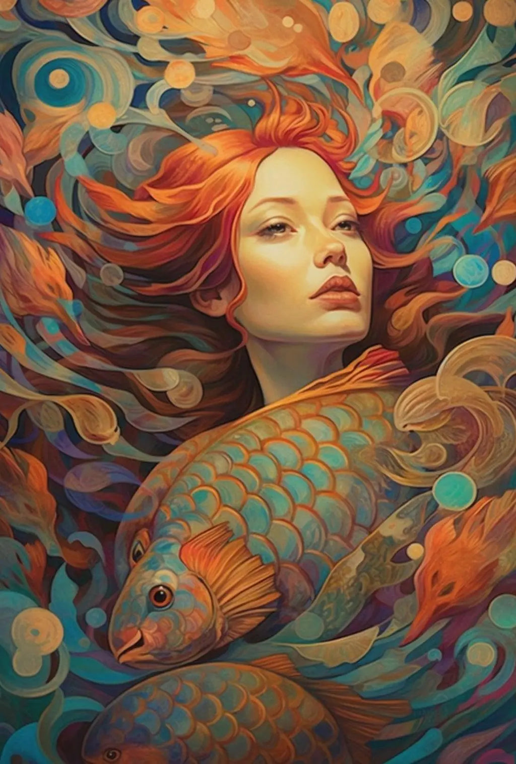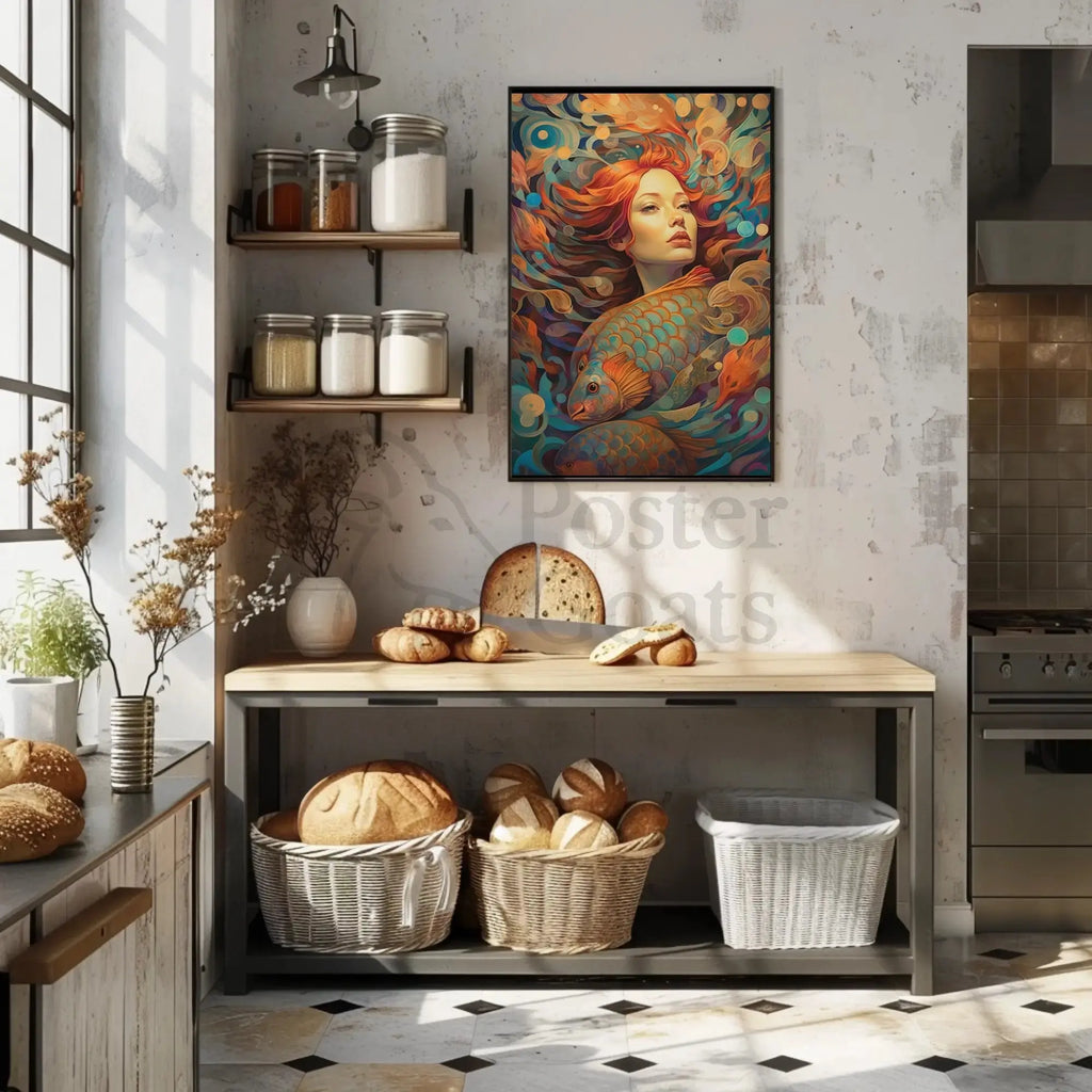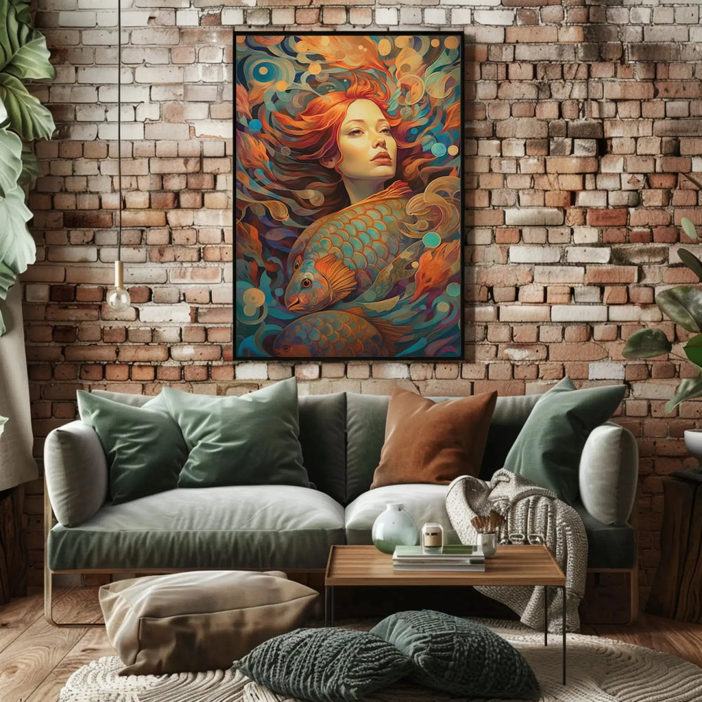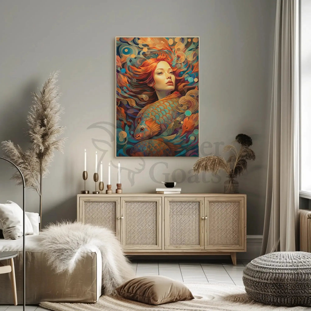 Bring a dreamlike calm to your walls with the Surreal Tranquility Artistic Design Art Nouveau Poster by PosterGoat. This richly detailed poster blends Art Nouveau curves with surrealist composition—featuring a serene female portrait amid flowing, flame‑red hair and iridescent koi that swim through swirling, ornamental patterns. The result is a graceful, sophisticated focal point for living rooms, bedrooms, offices, or creative spaces.