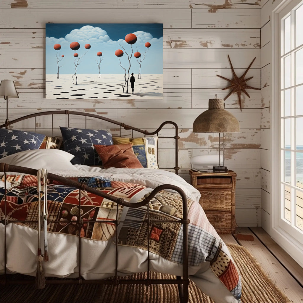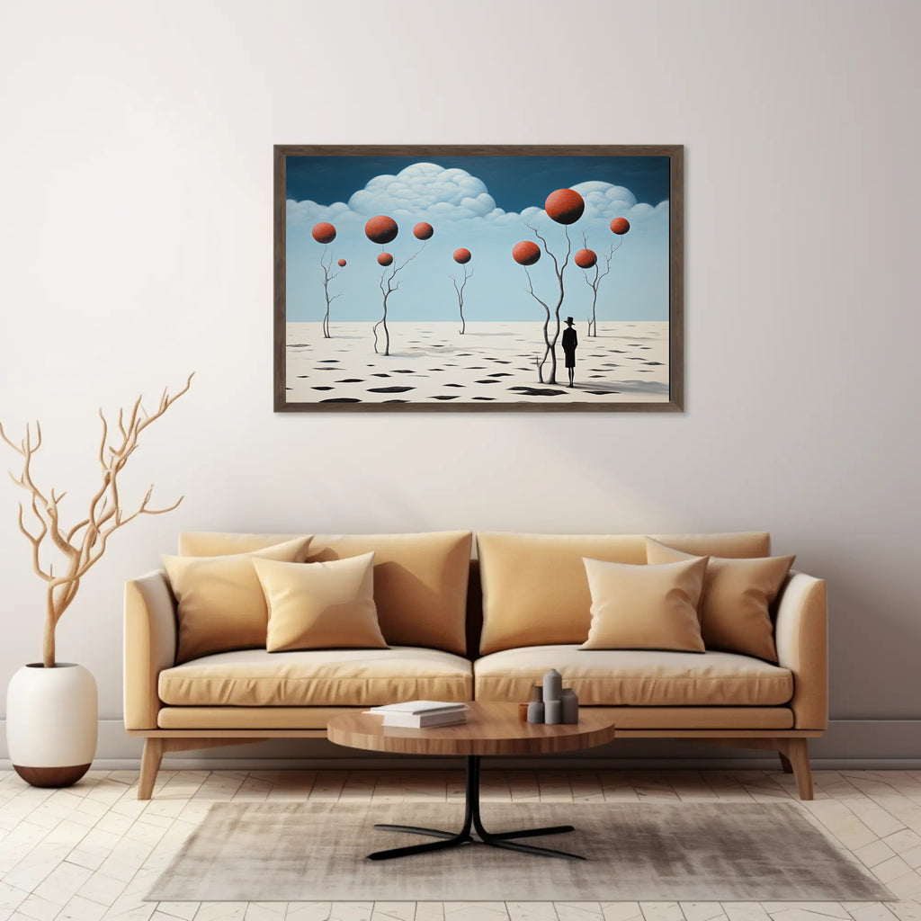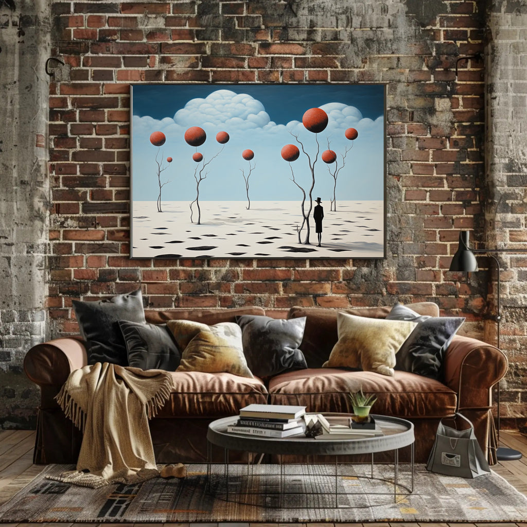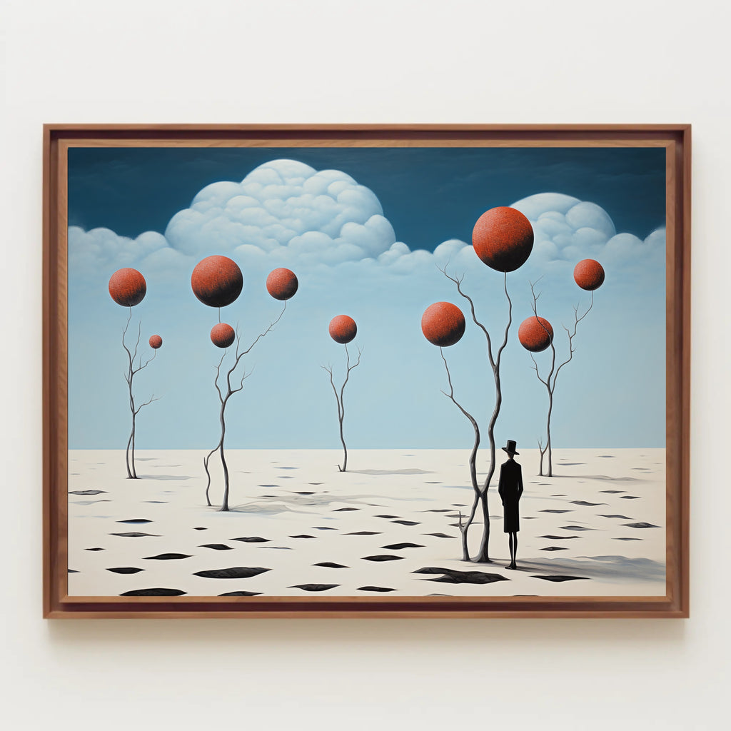 Immerse your space in a visionary scene with the Surreal Trees in Desert Futuristic Sci‑Fi Poster by PosterGoat. This striking print captures a dreamlike desert: thin, leafless trunks rise from a pale, cracked sand plain, each crowned with a vivid red spherical top that floats like a fragile planet against an expansive blue sky dotted with billowing clouds. A solitary figure in formal dark attire adds an enigmatic, cinematic touch—perfect for fans of surrealism and modern, conversation-starting wall art.