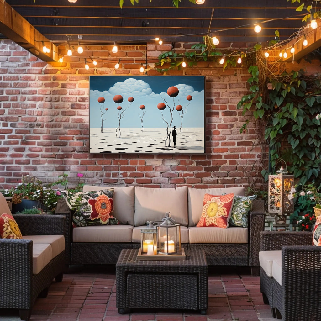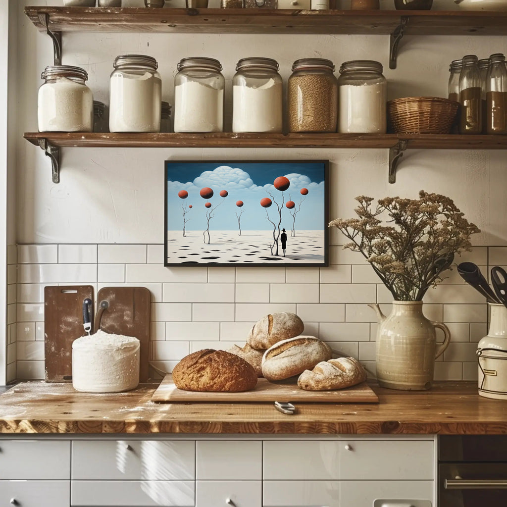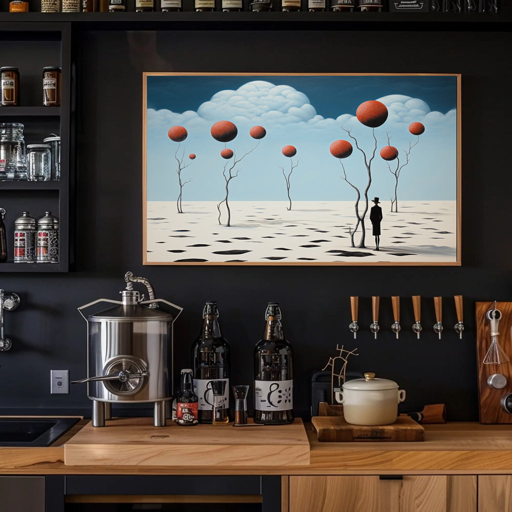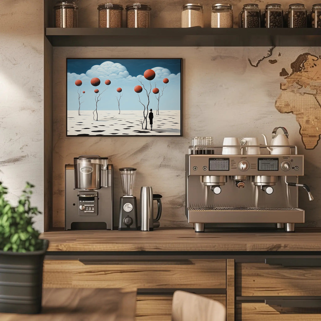 Immerse your space in a visionary scene with the Surreal Trees in Desert Futuristic Sci‑Fi Poster by PosterGoat. This striking print captures a dreamlike desert: thin, leafless trunks rise from a pale, cracked sand plain, each crowned with a vivid red spherical top that floats like a fragile planet against an expansive blue sky dotted with billowing clouds. A solitary figure in formal dark attire adds an enigmatic, cinematic touch—perfect for fans of surrealism and modern, conversation-starting wall art.