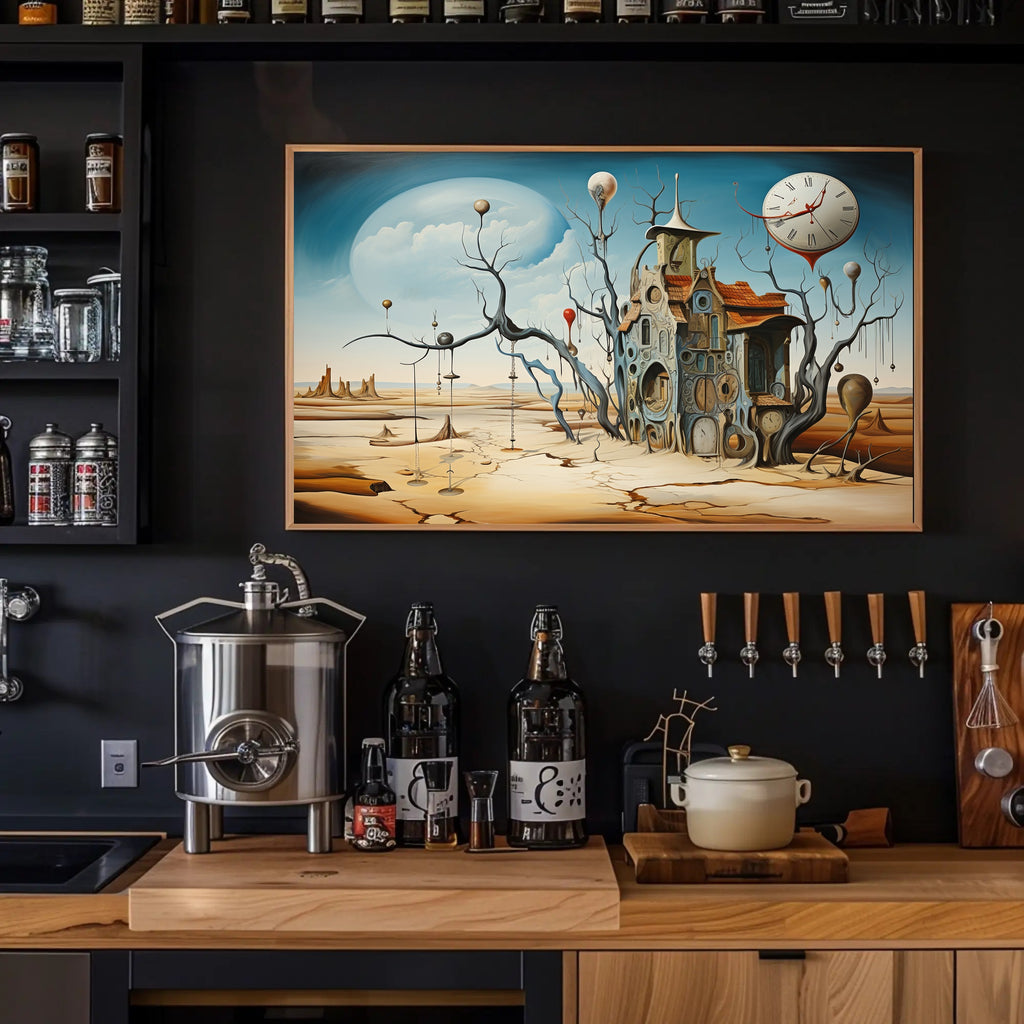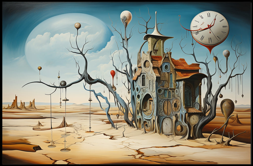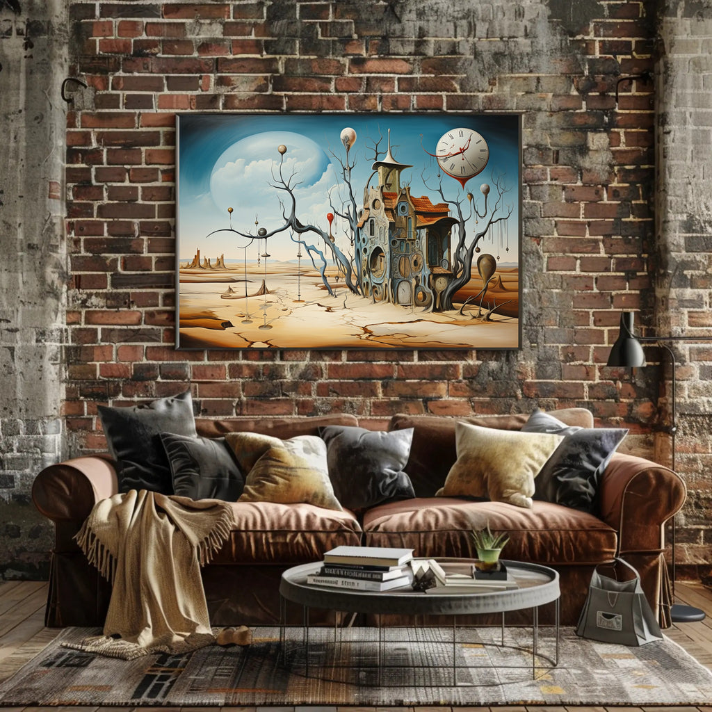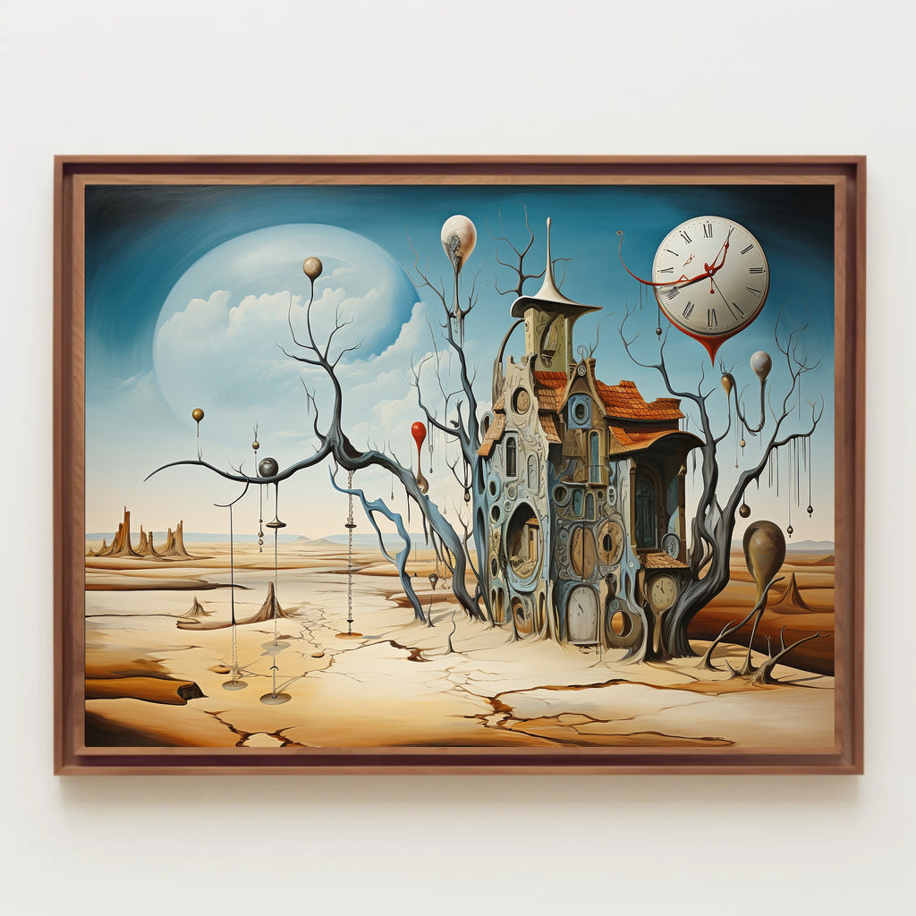 Immerse your space in a dreamlike desert where time flows and reality warps — the Surrealistic Timepiece Desert Art Print by PosterGoat captures an evocative, Dali‑inspired landscape featuring a melting clock, cracked sand plains, and an intricate house woven from circular timepieces. This abstract poster marries surrealism and contemporary art to create a striking focal point for living rooms, offices, studios, or gallery walls.
